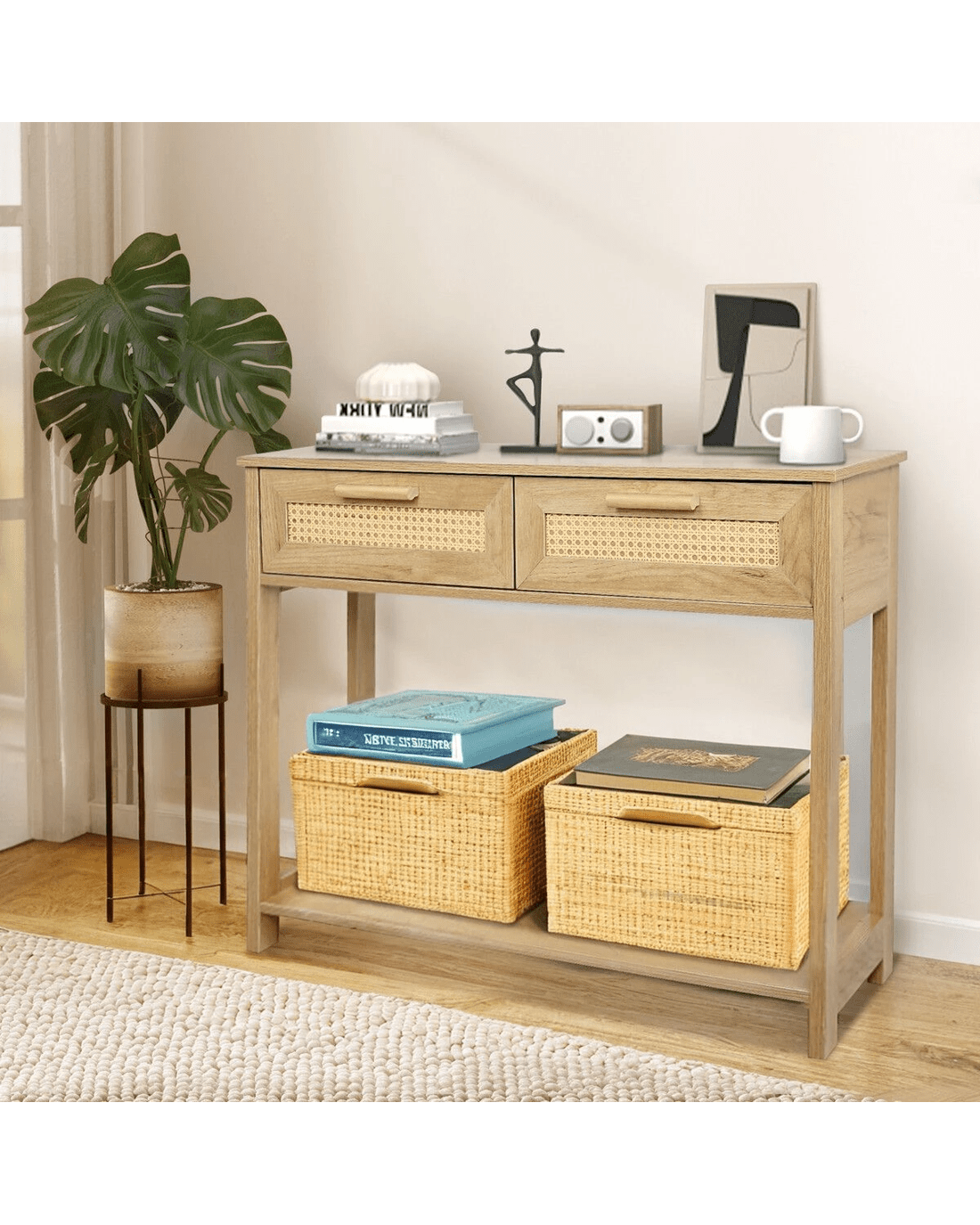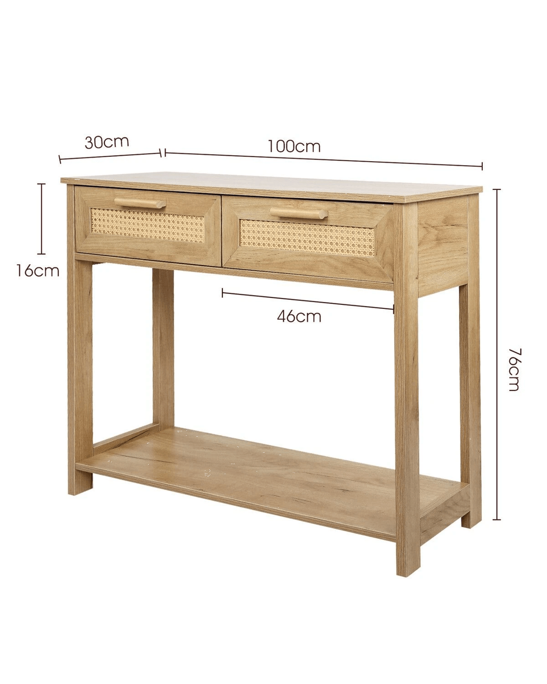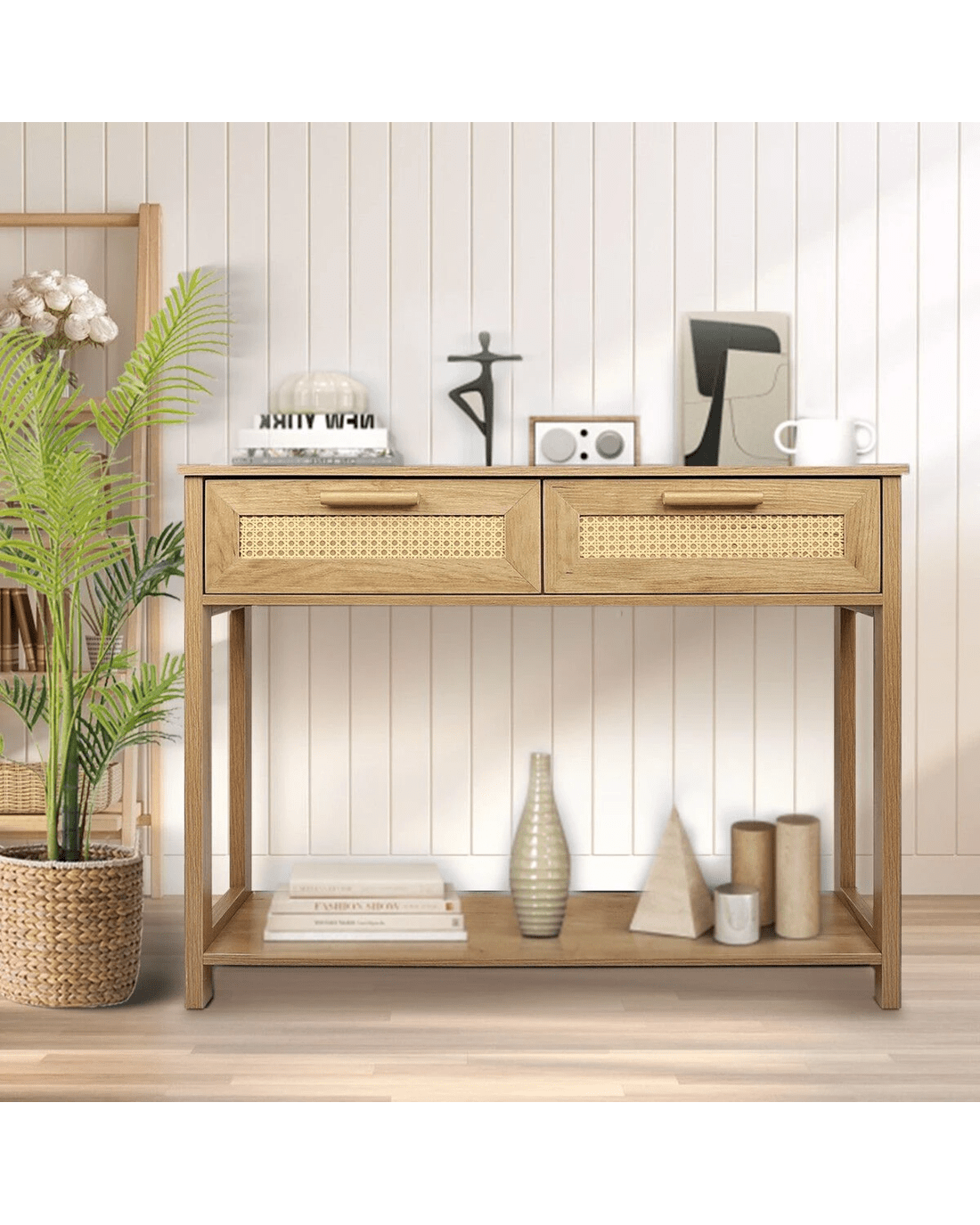 Accentuate your space’s ambience with this narrow console table, a versatile and elegant addition to your home. Crafted from durable particle board with a wood veneer and PVC finish, it is dustproof, waterproof, and wear-resistant for lasting quality and easy upkeep. Measuring 100x30x76cm, this multifunctional piece serves as a console table, writing desk, sofa side table, or dining table, adapting effortlessly to your needs. Its spacious tabletop, drawers with integrated handles and rattan fronts, and lower shelf provide flexible storage while adding vintage charm. Also, its elevated base prevents moisture and simplifies cleaning to maintain a pristine look. This versatile furniture blends timeless design with practicality, perfect for entryways, living rooms, bedrooms, dining areas, or offices.