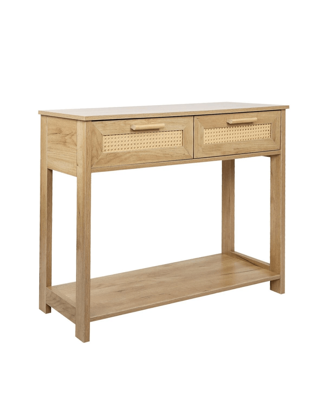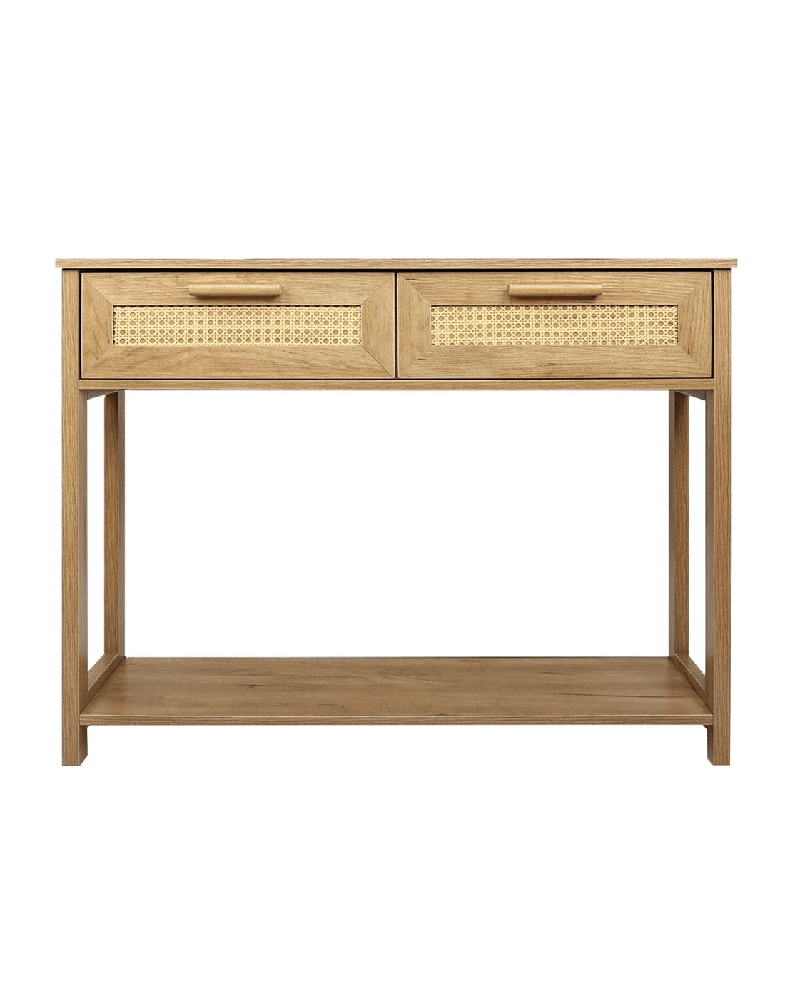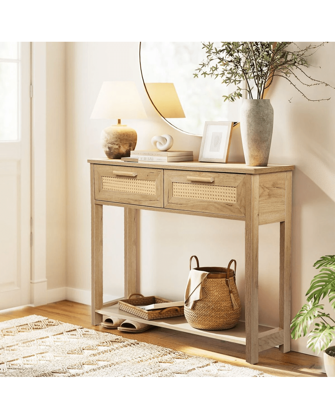 Accentuate your space’s ambience with this narrow console table, a versatile and elegant addition to your home. Crafted from durable particle board with a wood veneer and PVC finish, it is dustproof, waterproof, and wear-resistant for lasting quality and easy upkeep. Measuring 100x30x76cm, this multifunctional piece serves as a console table, writing desk, sofa side table, or dining table, adapting effortlessly to your needs. Its spacious tabletop, drawers with integrated handles and rattan fronts, and lower shelf provide flexible storage while adding vintage charm. Also, its elevated base prevents moisture and simplifies cleaning to maintain a pristine look. This versatile furniture blends timeless design with practicality, perfect for entryways, living rooms, bedrooms, dining areas, or offices.