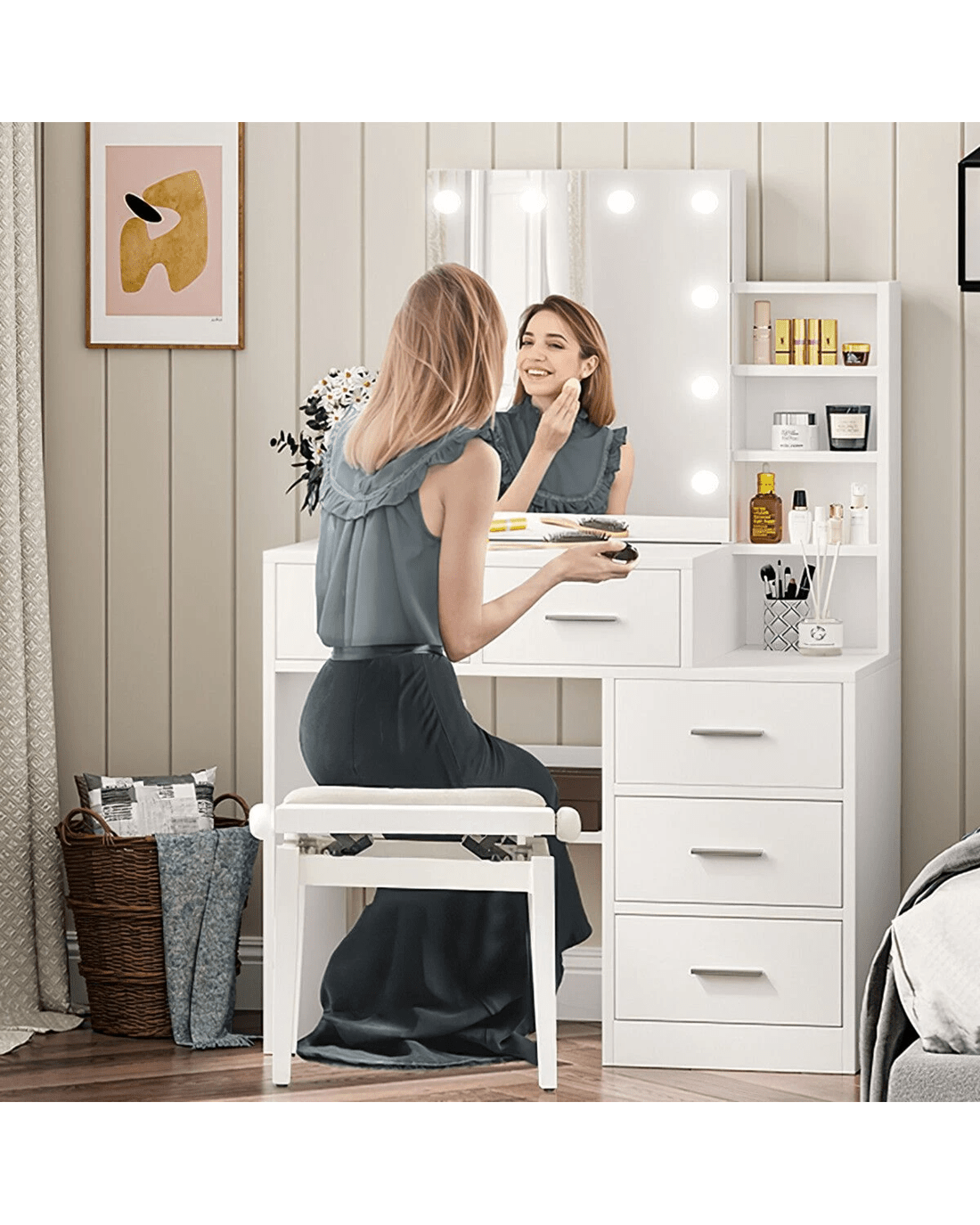 Better your beauty routine and make you feel more confident with this Hollywood Makeup Vanity Desk Dressing Table. Boasting a Hollywood-inspired mirror with 10 dimmable LED bulbs and three colour lighting modes, it provides the perfect lighting for flawless makeup application. And, the Hollywood mirror made of premium HD glass offers unmatched clarity, so every detail is beautifully captured. Five drawers and six handy shelves offer plenty of room to keep all your beauty essentials neatly organised and easily accessible. Finely crafted in eco-friendly particle boards with sturdy metal handles and smooth rails, this makeup vanity promises durability, sustainability and convenient everyday use. The classic white finish seamlessly blends modern simplicity with timeless elegance, making it a must-have to any home, bedroom, dressing room or studio. In addition, it features a hassle-free assembly process with clear detailed instructions and all necessary hardware included.