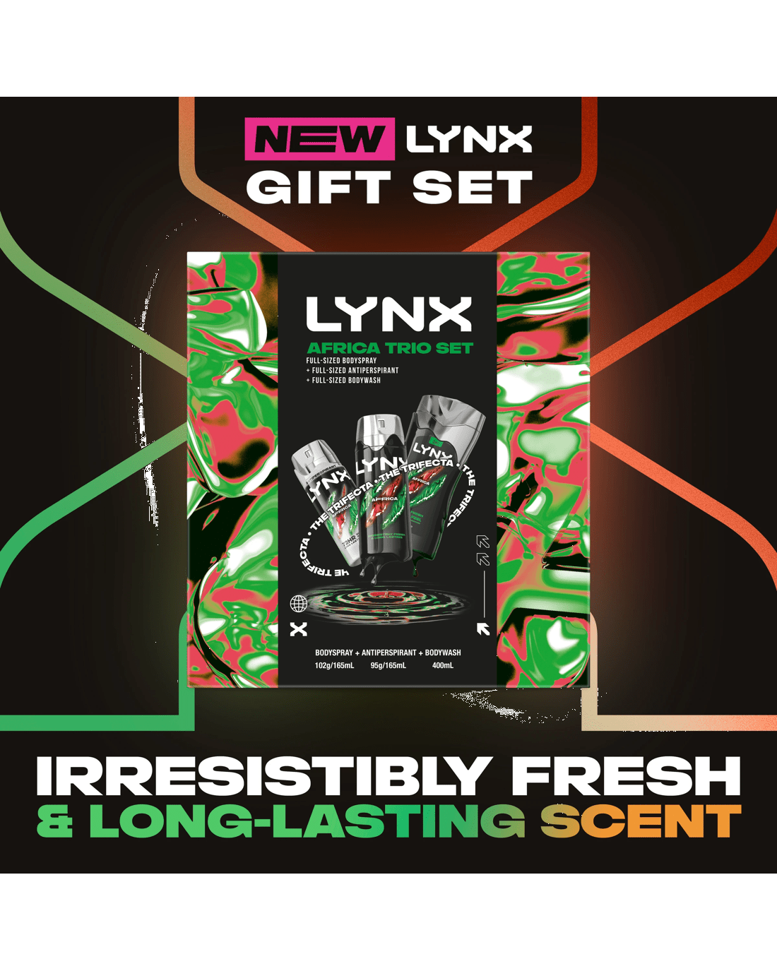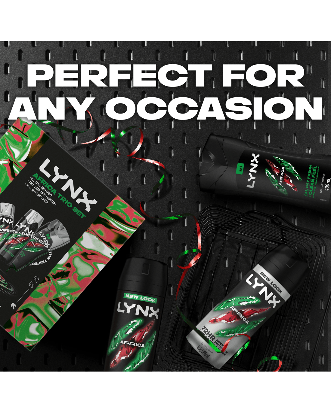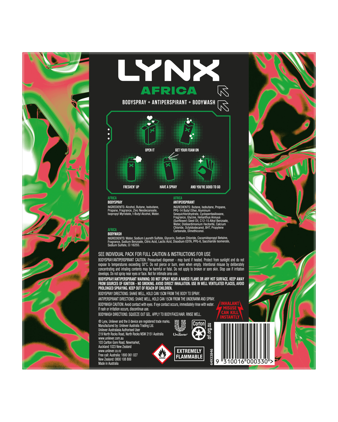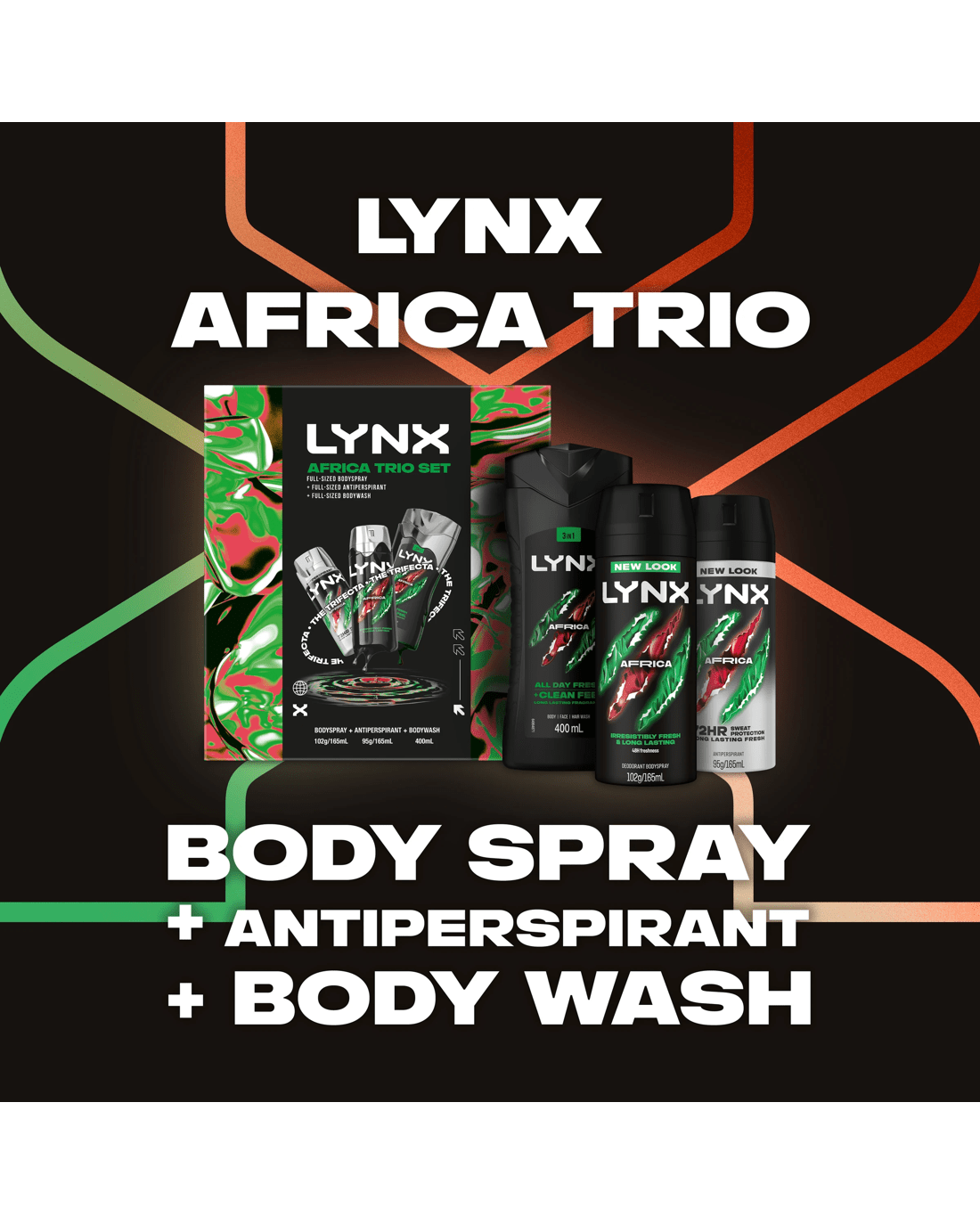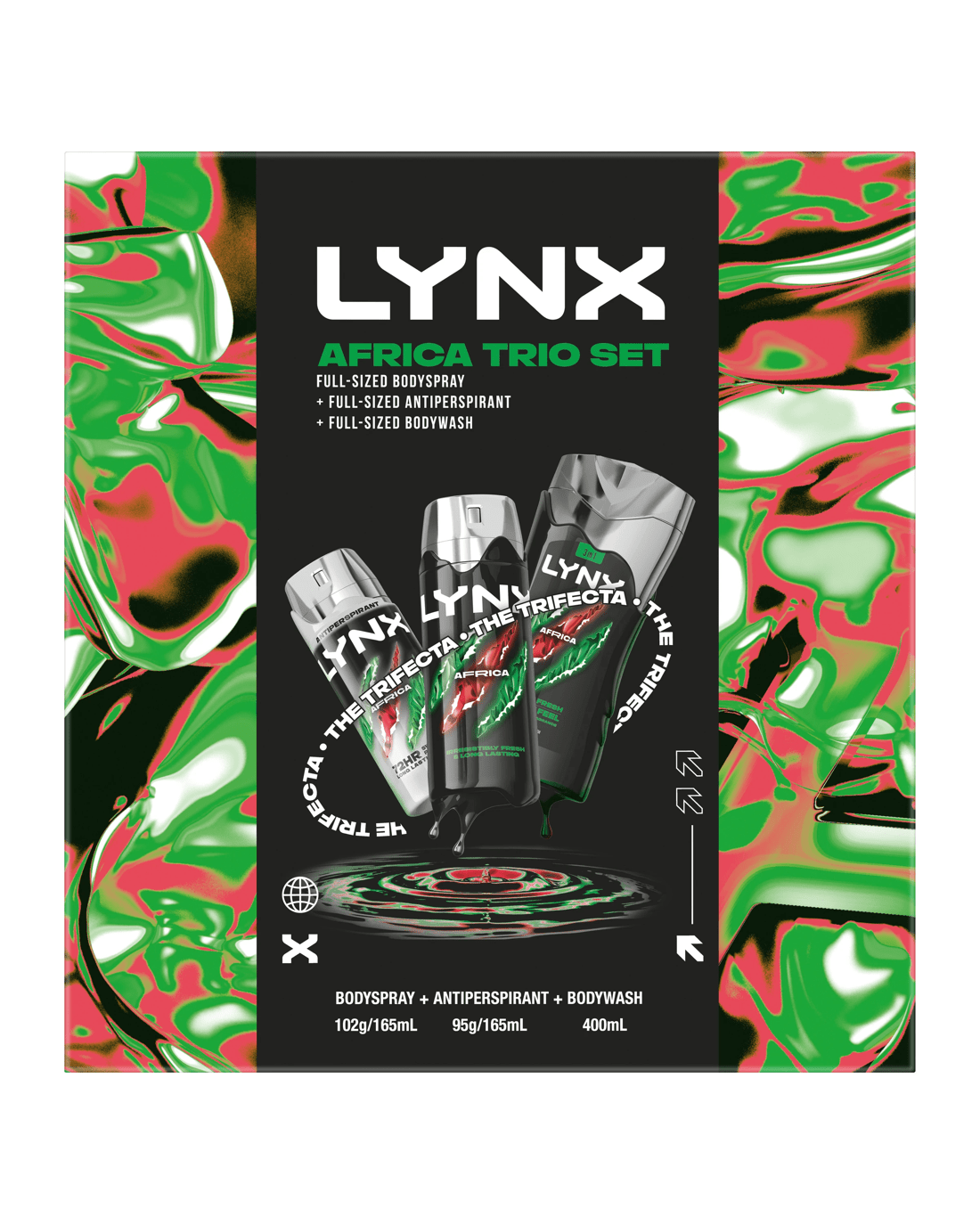 So, it’s gift-giving time again. Time to take the guesswork out of getting it right and grab the Lynx Duo Africa Gift Set. Son, brother, husband, dad, uncle, cousin... whoever he is, whatever the occasion, there’ll be no fake happiness when he unwraps this gift. Teaming a full-sized Lynx Africa Deodorant Body Spray 165ml with a full-sized Lynx Africa Shower Gel 400ml, this set has got him covered with the most iconic fragrance of all time, featuring squeezed mandarin and sandalwood notes. The body spray features our revolutionary dual-action technology that fights odour-causing bacteria to help him bust odour and smell iconic for forty-eight hours. The shower gel helps him kick-start his day with a powerful blast of spicy freshness and leaves him feeling clean and smelling 100% irresistible.