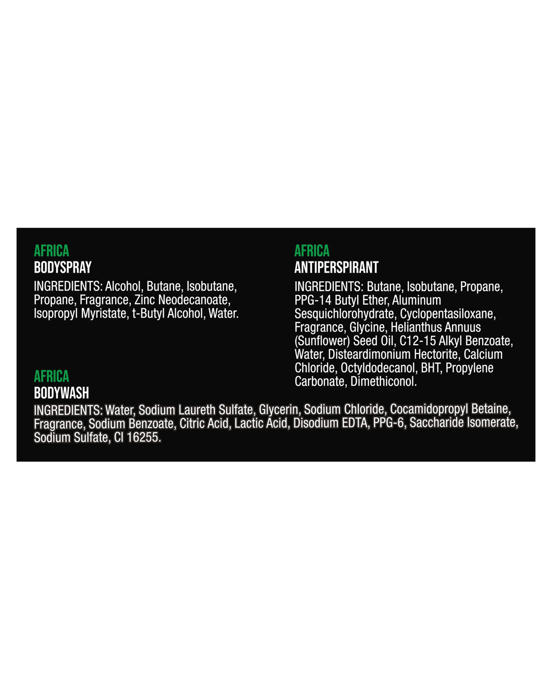 - Includes 1 x bodyspray, 1 x bodywash and 1 x antiperspirant