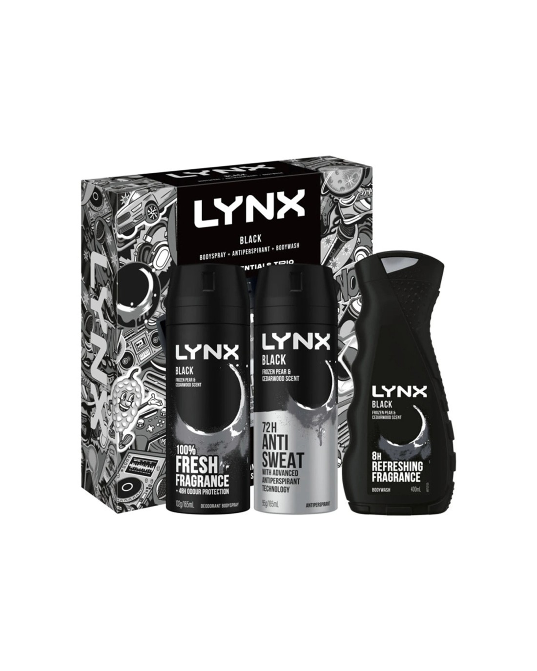 Looking for the best gift for him? You can't go wrong with Lynx Black Trio Gift Set made up of a full-sized Lynx Black Body spray 165 ml, full-sized Black Anti-Perspirant and a full-sized Lynx Black Bodywash 400 ml. Lynx Black is a classic and timeless fragrance for the modern man. Without trying too hard, it makes its presence felt with notes of watermelon, bergamot and frozen pear. A head-turning combo. The body spray features our revolutionary dual-action technology that fights odour-causing bacteria to help him bust odour and smell iconic for 48 hours. Developed using our unique pro-scent technology, the anti-perspirant deodorant guarantees up to 72 hours of dryness and freshness, protecting against wetness and body odour before they even start. The shower gel helps him kick-start his day with a powerful blast of freshness and leaves him feeling clean and smelling 100% irresistible.
