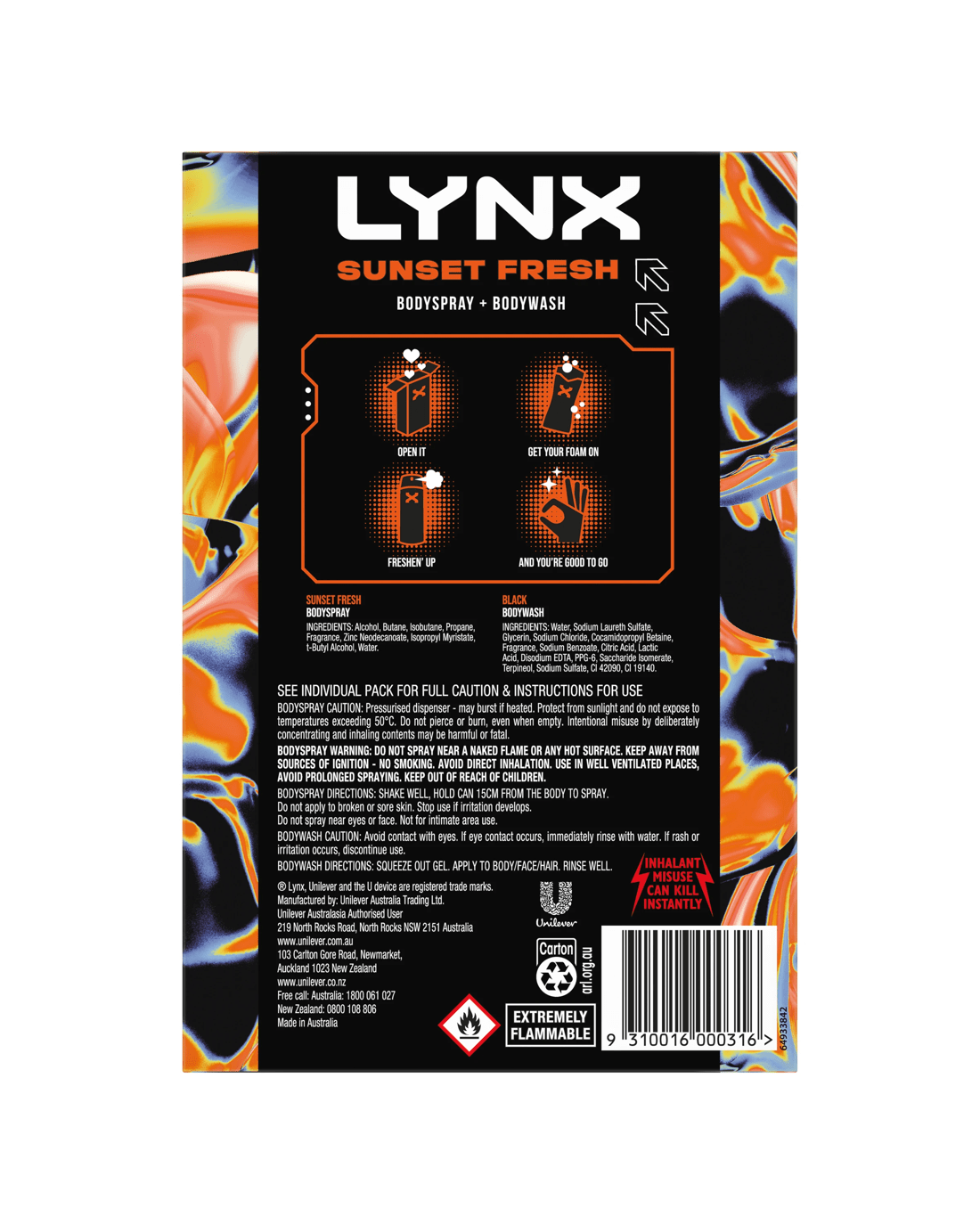 Looking for the best gift for him? You can't go wrong with the LYNX Sunset Fresh Duo Gift Set, made up of a full-sized LYNX Sunset Fresh Bodyspray 165ml and full-sized LYNX Black Bodywash 400ml. This is a head-turning combo. The body spray features our revolutionary dual-action technology that fights odour-causing bacteria to help him bust odour and smell iconic for 48 hours. The shower gel helps him kick-start his day with a powerful blast of freshness and leaves him feeling clean and smelling 100% irresistible.