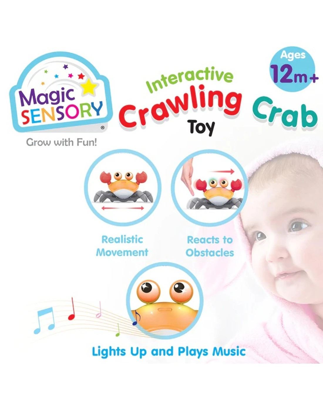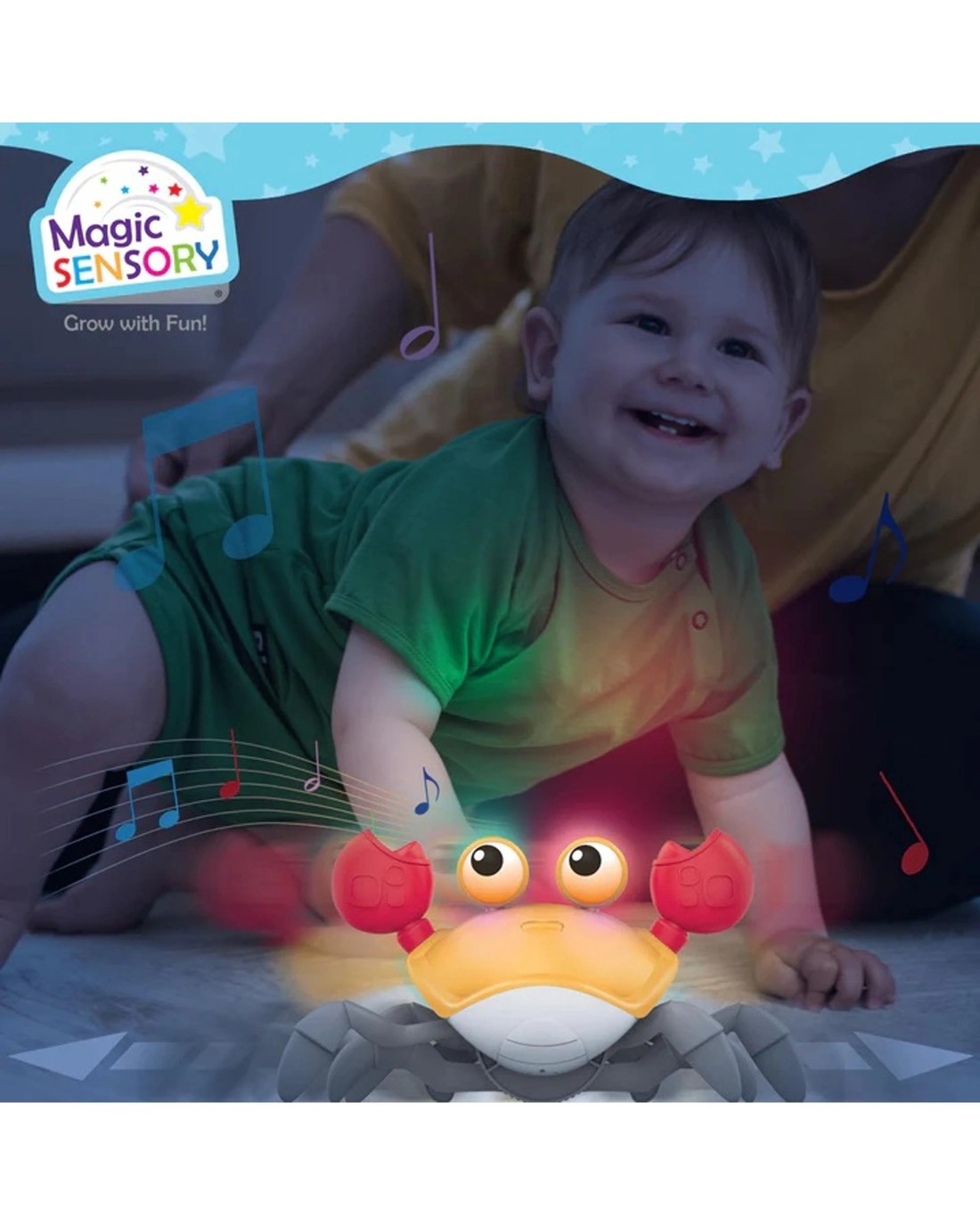 - But that's not all; this clever crab is equipped with sensors that detect obstacles in its path, ensuring smooth navigation and endless fun. When it encounters an obstacle, the Crawling Crab Toy lights up and plays cheerful music, adding an extra element of excitement to playtime.