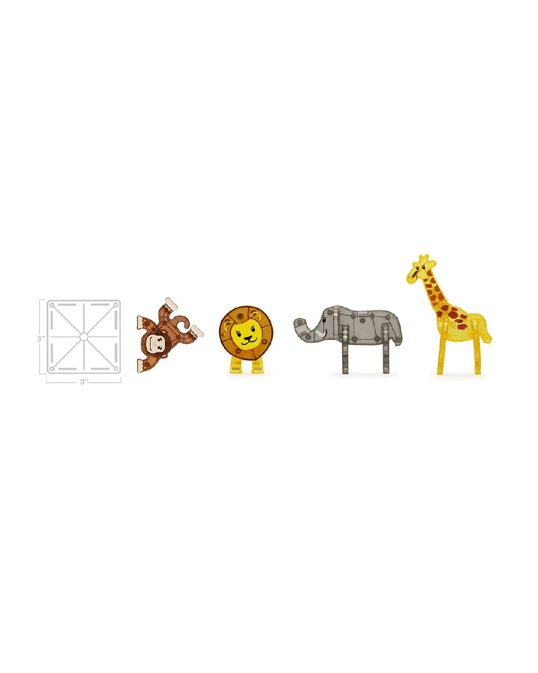 - The included pieces are 4 safari figurines: giraffe, monkey, lion and elephant, 9 squares, 2 right triangles, 2 isosceles triangles, 6 equilateral triangles, 1 arch and 1 pentagon.