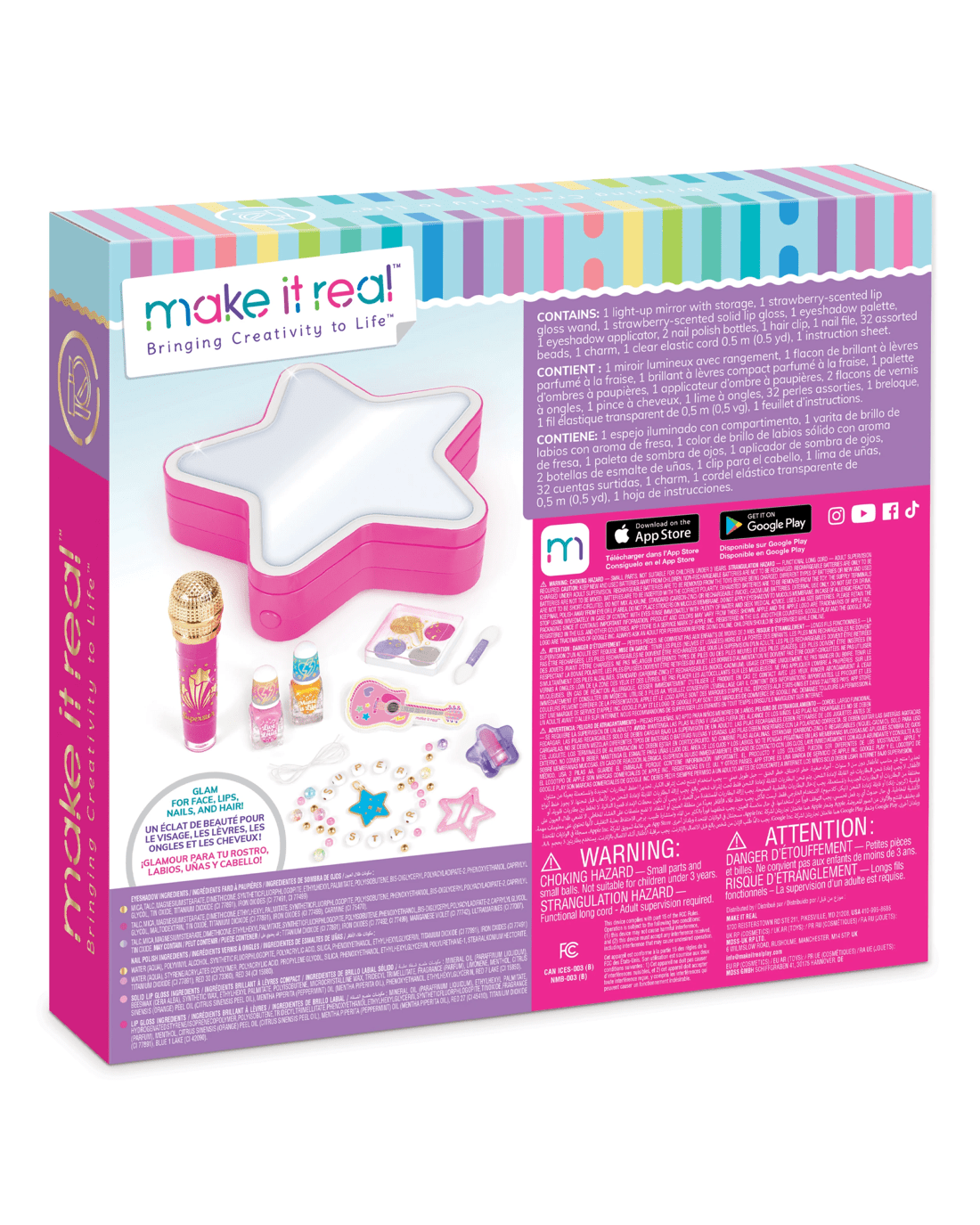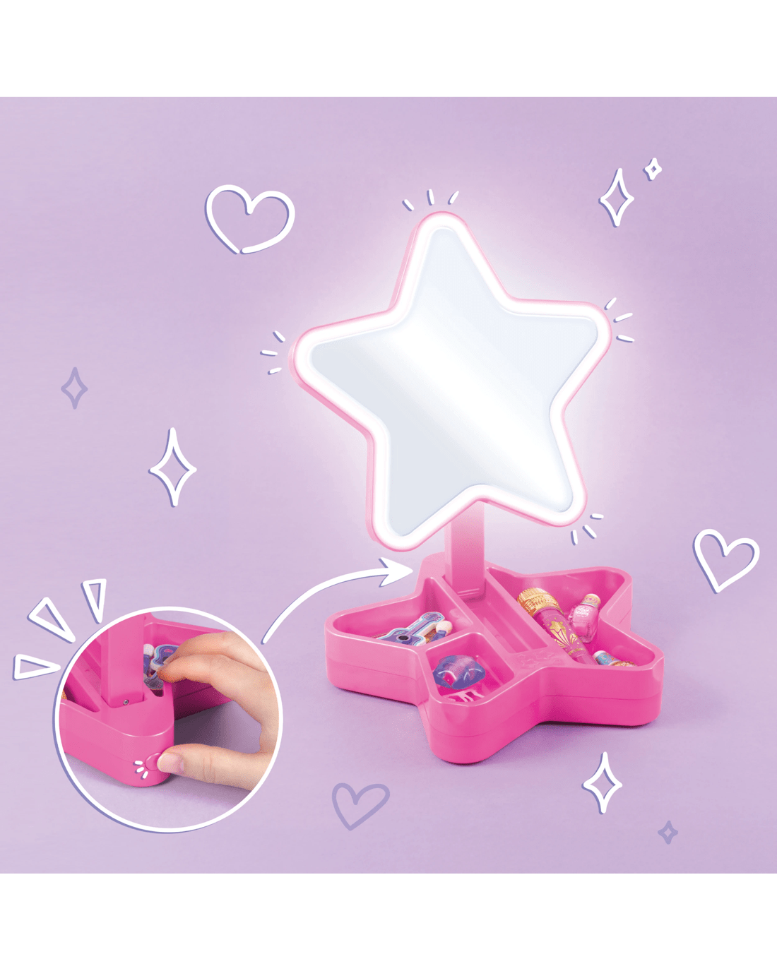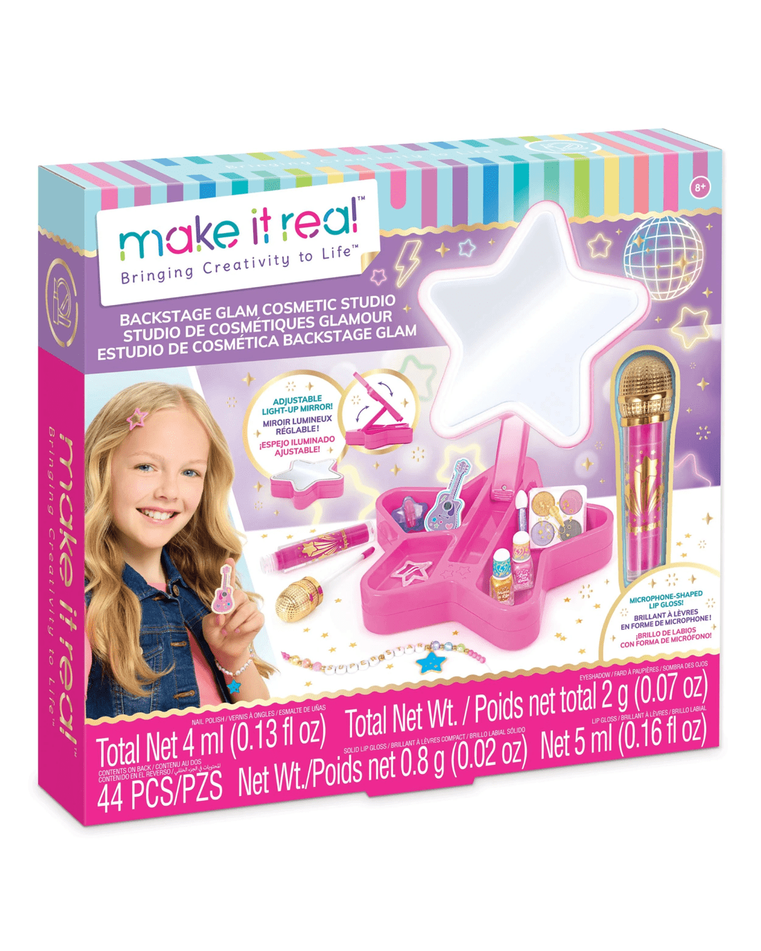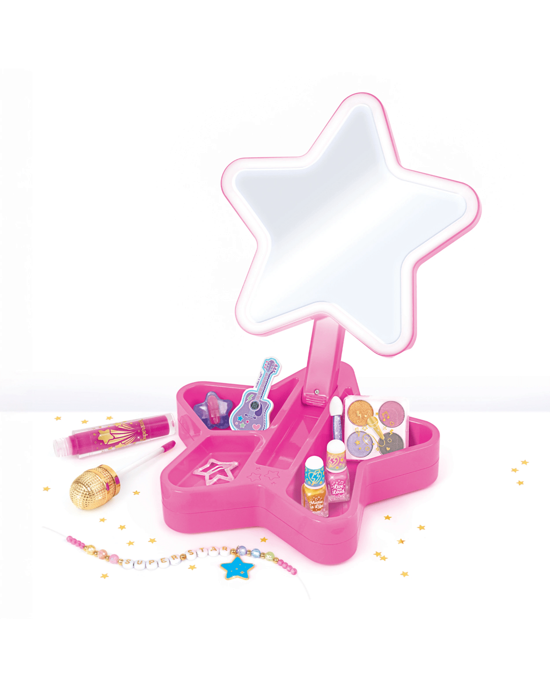 Step into the spotlight with the Make It Real Backstage Glam Cosmetic Studio and let creativity shine bright. This playful set features a light-up star-shaped mirror that helps kids craft their favourite looks while feeling like a true pop star. With a collection of music-inspired cosmetics and tools plus materials to make a personalised beaded bracelet, every detail invites self-expression and fun. The star base offers a tidy space to store all accessories and keeps the dressing table neat thanks to its clever folding mirror design. Perfect for gifting, this set is ideal for budding stylists aged 8 and up eager to experiment with colours and styles in a cheerful, age-appropriate way. Encourage imagination, boost confidence, and brighten up playtime—make every day a glam adventure by bringing this joyful set home today.Features