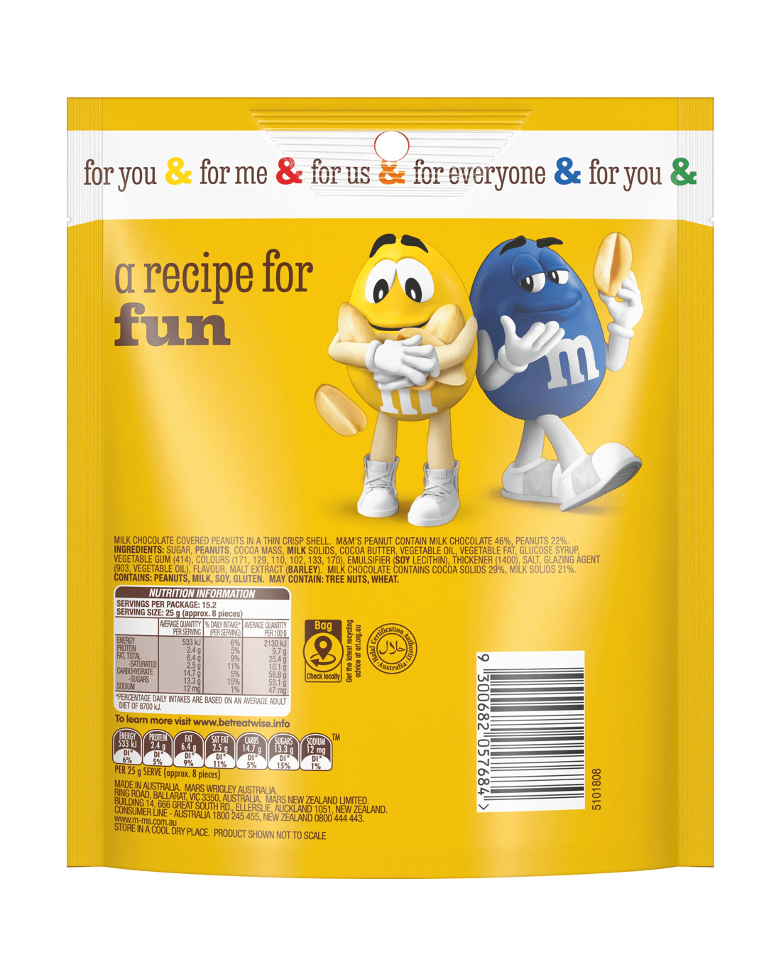 Call off the search! Because those deliciously fun bite size chocolate snacks you’ve been looking for are right here in this share pack of M&M’s peanut Chocolate legends! These mouthwatering M&M’S Milk Chocolate covered peanuts in thin crisp shells have been sending chocolate lovers nuts across the globe since 1954. That’s because these chocolate treats make the perfect screen-time chocolate snacks, whether you're sharing them as movie night chocolate treats or enjoying them when you stream your favourite shows. For something different, why not try sprinkling their happy M&M's peanut Chocolate colours into baking recipes, popcorn TV snacks or even banana splits! Did you know that M&M’s Chocolates were the first lollies to rocket into space? So for chocolate snacks that are literally out of this world, grab this bag of scrumptious M&M’s Chocolates! Party at your place? It starts with M&M’s peanut Chocolates.