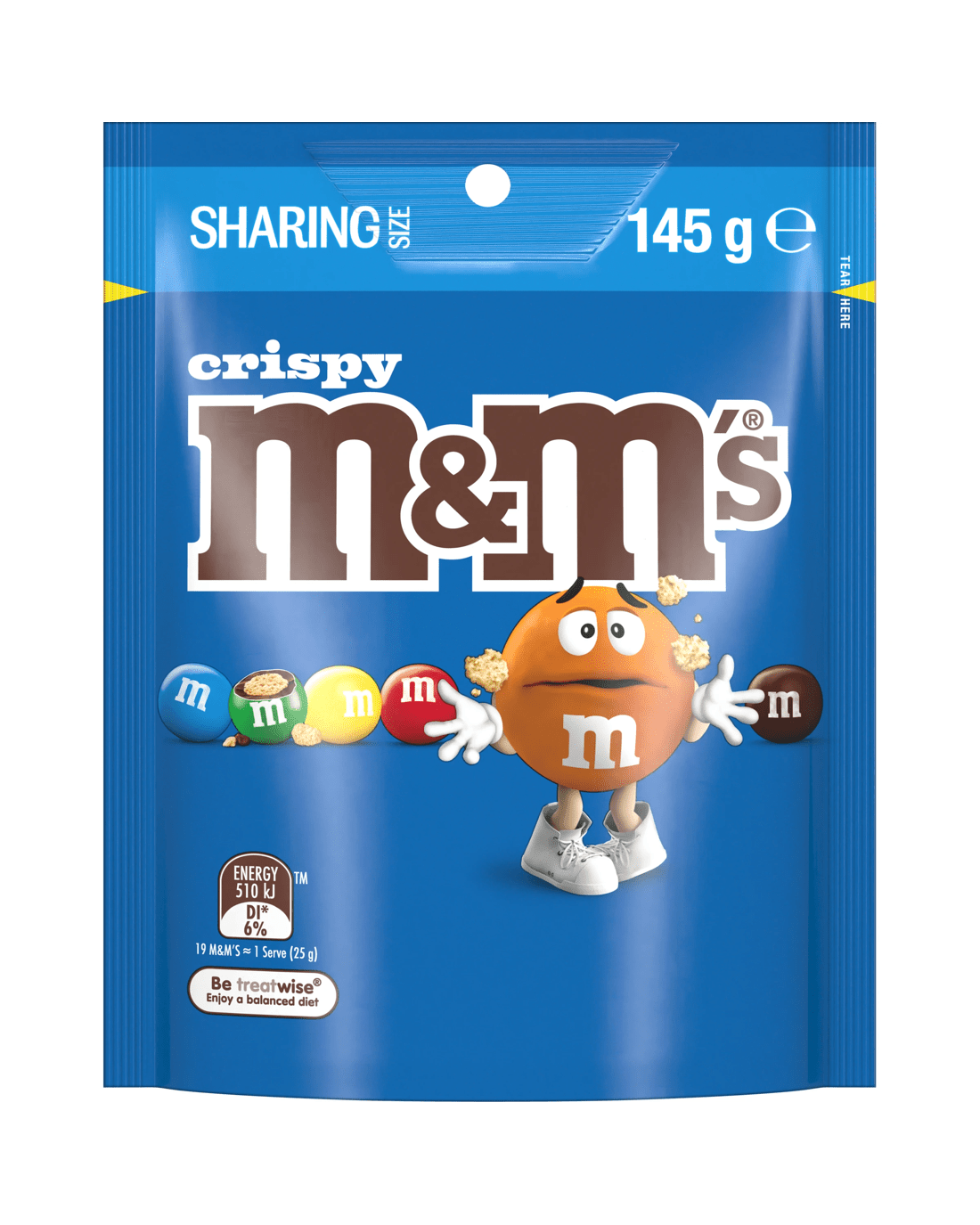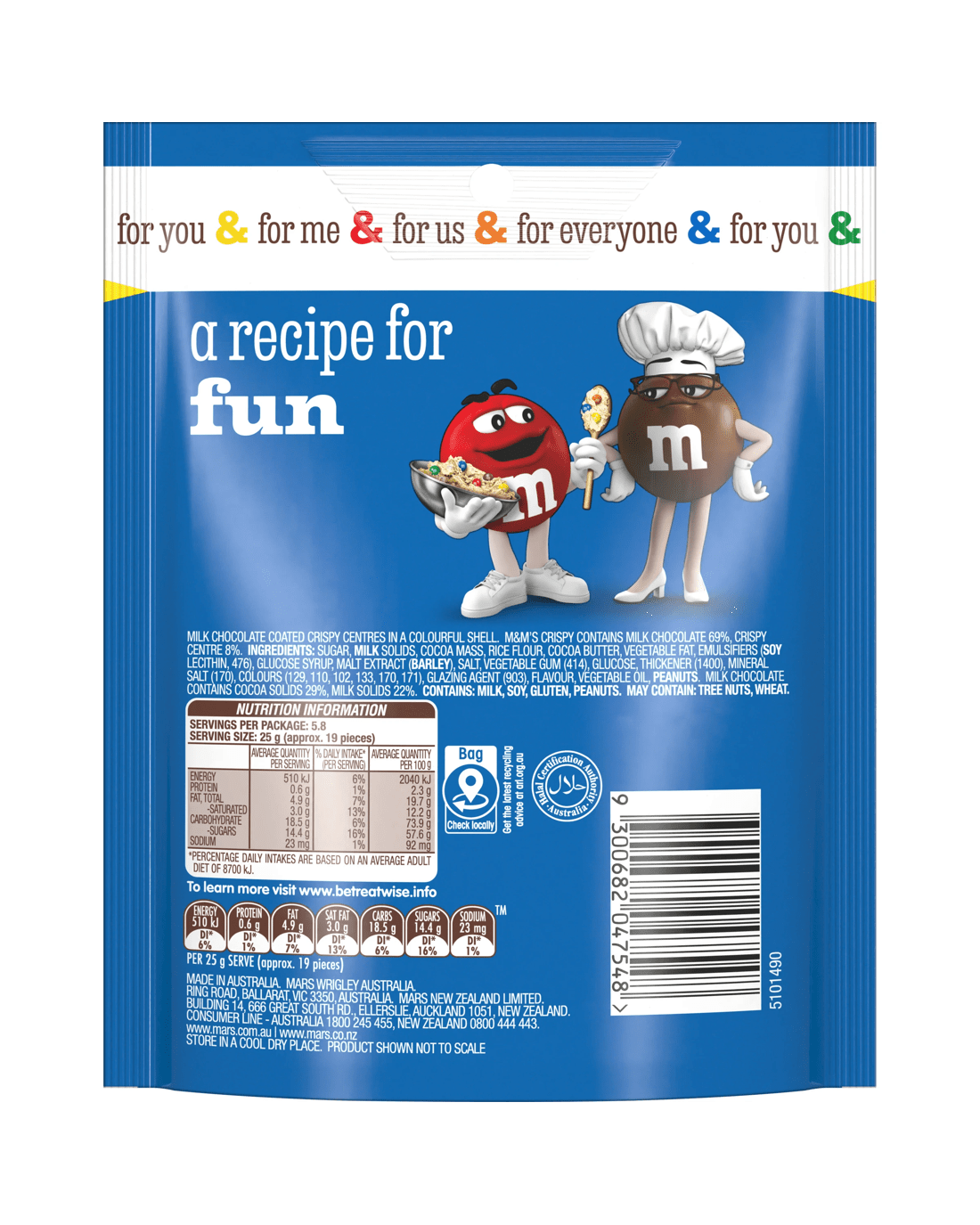 Call off the search! Because those deliciously fun bite size chocolate snacks you’ve been looking for are right here in this share bag of M&M’S crispy Chocolate legends! These mouth-watering M&M’S Milk Chocolate coated crispy centres in thin crisp shells have delighted chocolate lovers across the globe since 1999. That’s because these chocolate treats add colourful fun to parties, Halloween chocolate bowls, baking recipes and movie nights! So for chocolate snacks that are out of this world, grab this bag of scrumptious M&M’S Chocolates! Party at your place? It starts with M&M’S Chocolates!