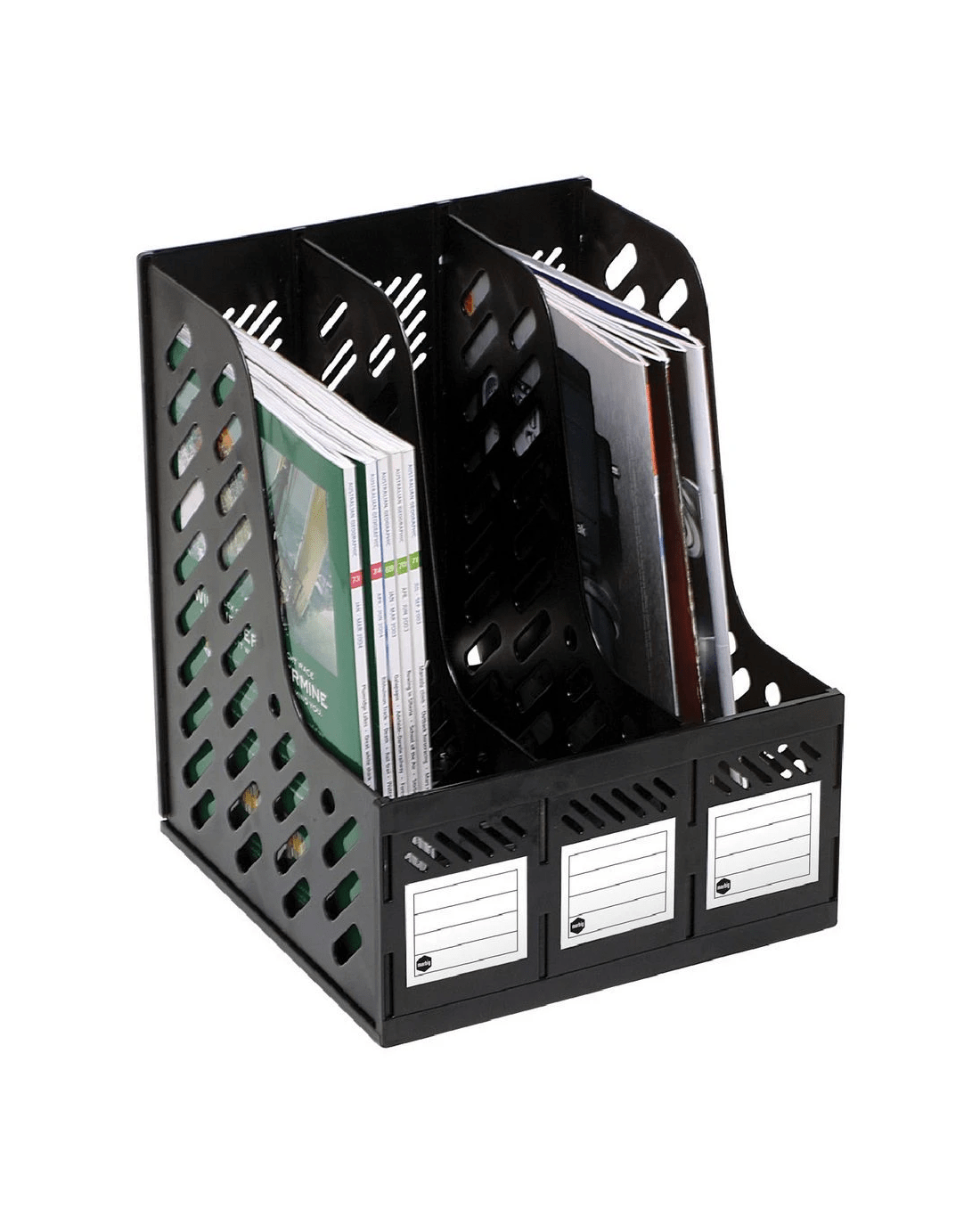 This Marbig 3 Section Magazine Rack is an ideal desktop storage solution allowing you to tidy up your books, reports, documents and more. The high sides prevent your magazines and books from falling out or toppling over. The labels on the front and back of spine allow you to quickly and easily identify what's inside.
