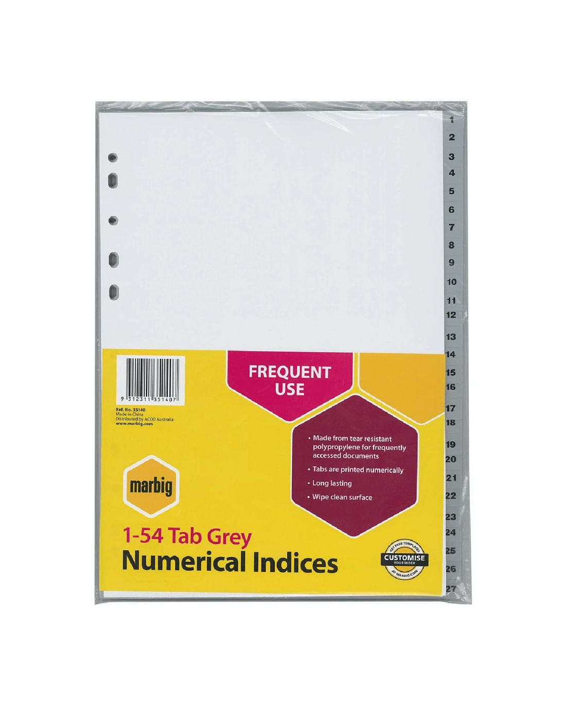 The Marbig A4 1-54 Divider Tab is a great way to get your indexing in order. The divider pages are durable and the tabs are used to easily divide files in your binders and filing systems thanks to the numerical tabs.