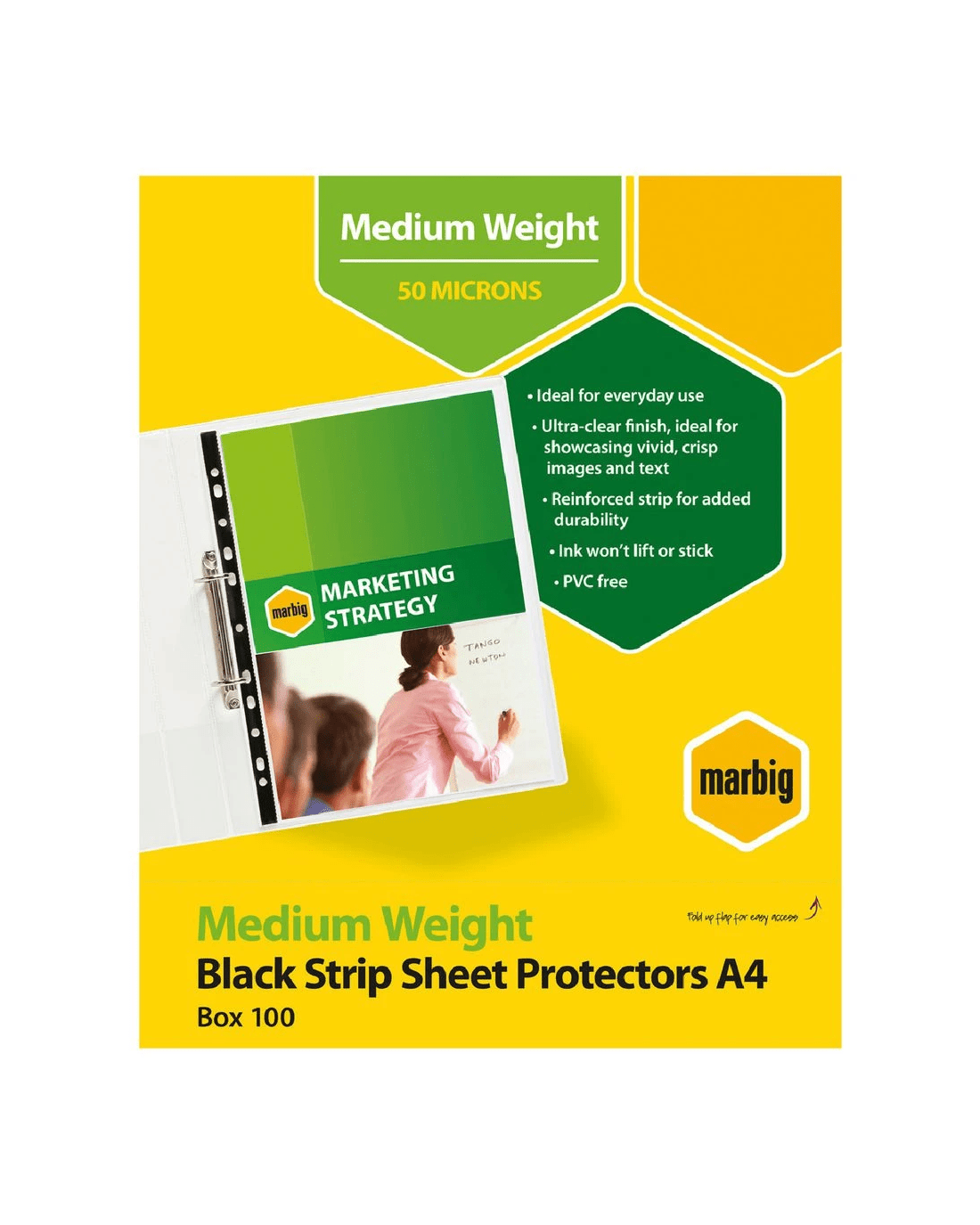 Marbig A4 Medium Weight Sheet Protectors are perfect for storing and protecting your documents against everyday wear and tear. The high quality sheet protectors have a black strip which would be great for presentations.
