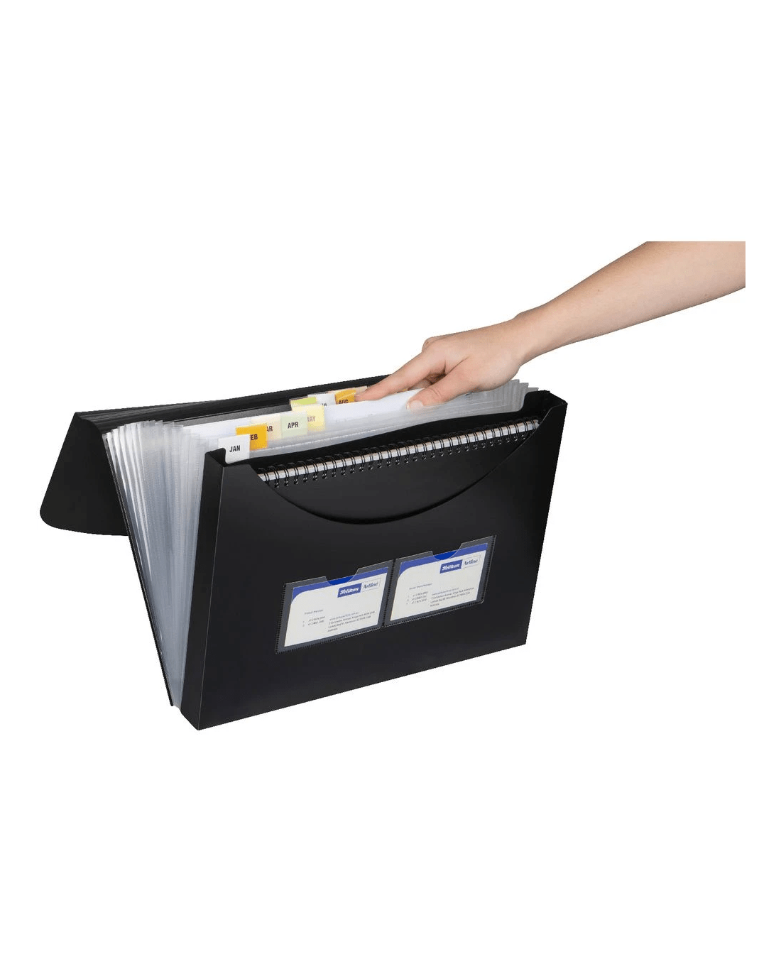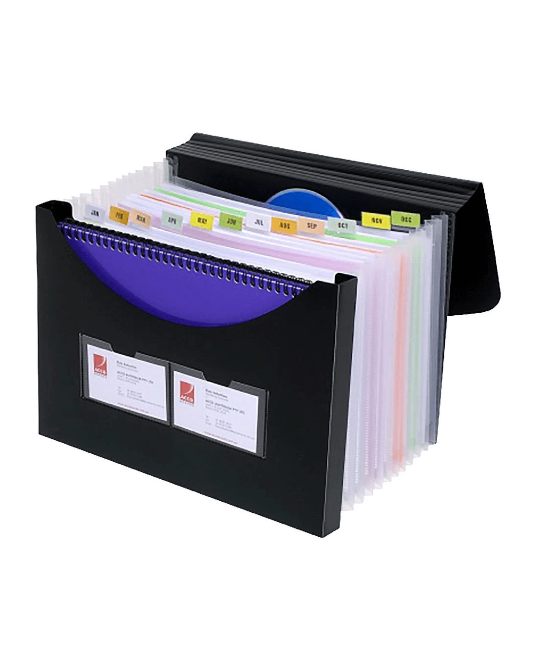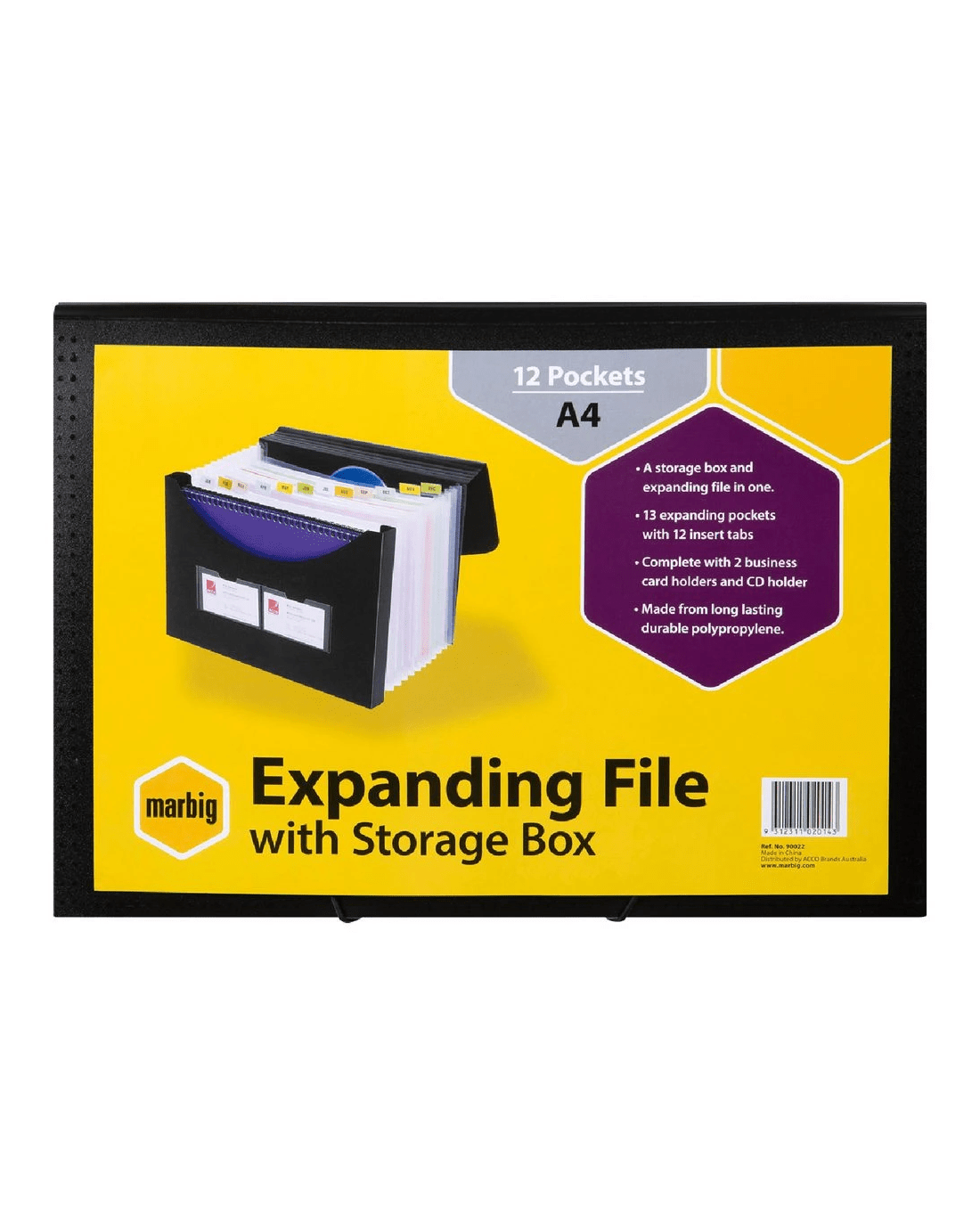 This Marbig Expanding File Box is a storage box and an expanding file in one. It has 13 expanding pockets with 12 insert tabs and business card and DVD holders, with extra storage for bulky documents or display books. It sits securely on your desk and closes with an elastic loop to keep everything inside safe.