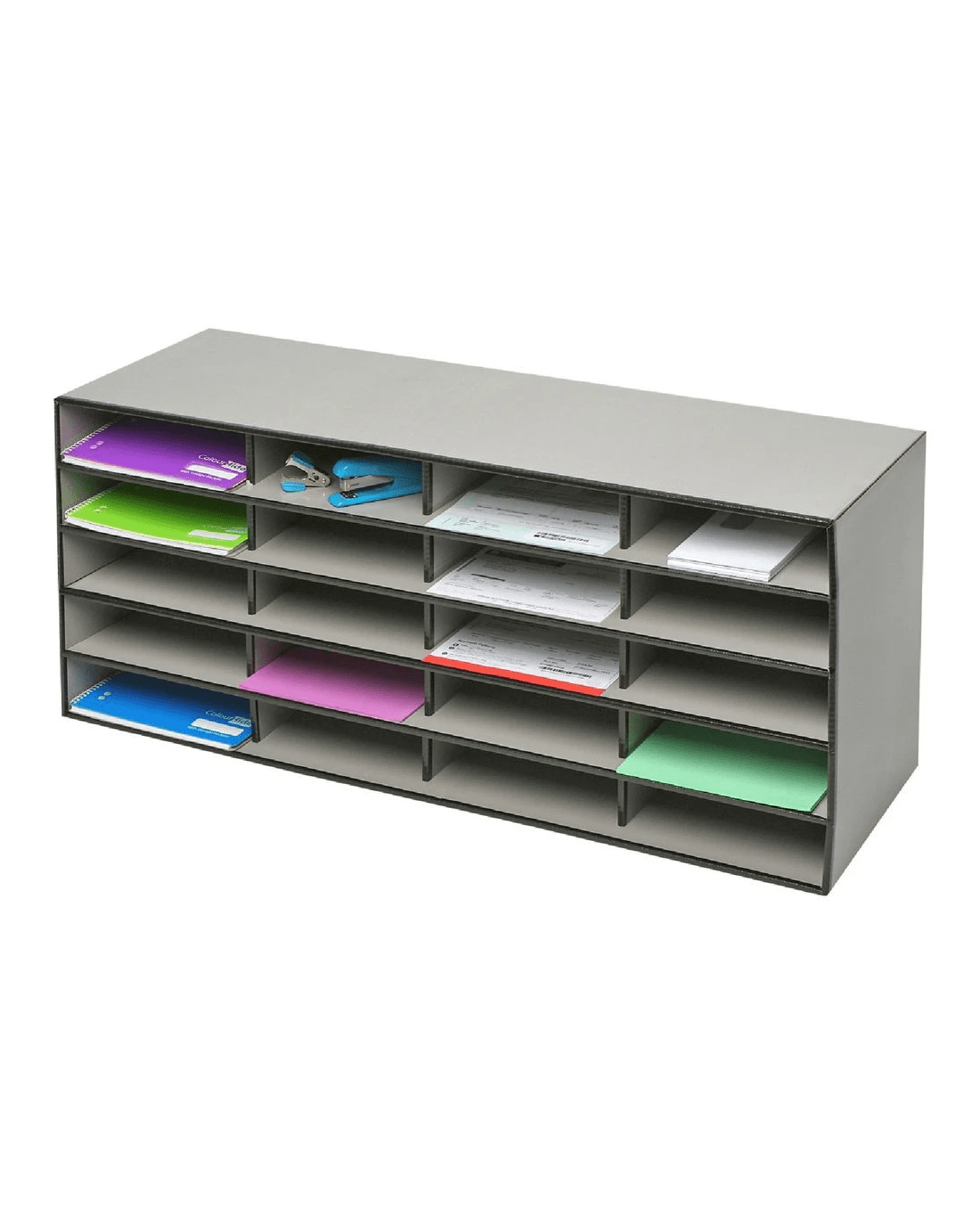 This Marbig Literature Sorter has a heavy card construction and can be placed upon desk tops, counter tops and more. It can be used to separate stationery, brochures, papers and mail. There are 20 compartments in this sorter so you can also use this unit as pigeon holes for staff members.