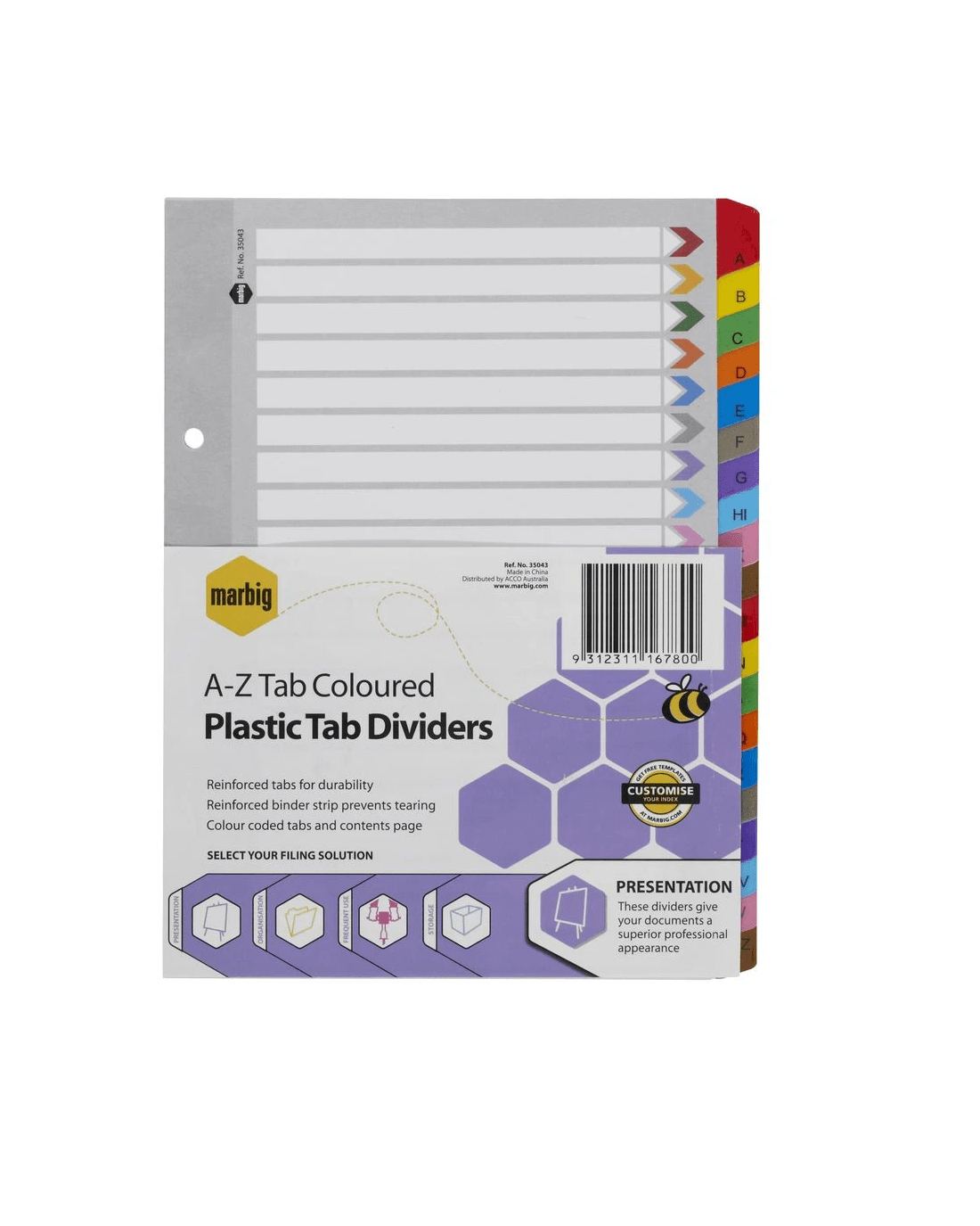 These Marbig Reinforced Tab Dividers feature 20 printed tabs allowing you to easily organise your files into alphabetical sections. They are made from reinforced manilla board with plastic tabs and binder stripping for durability. It includes a table of contents page so you can write specifically what is in each category.