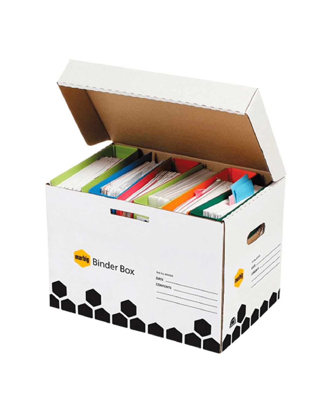 The Marbig Archive Binder Box is designed to hold 6 lever arch files making it a convenient storage solution. These boxes are incredibly tough thanks to their triple end walls double layer base, which allows them to stack up to six high when full. The burst-safe base means you can carry a load of up to 20 kg with the guarantee that the box will not break.
