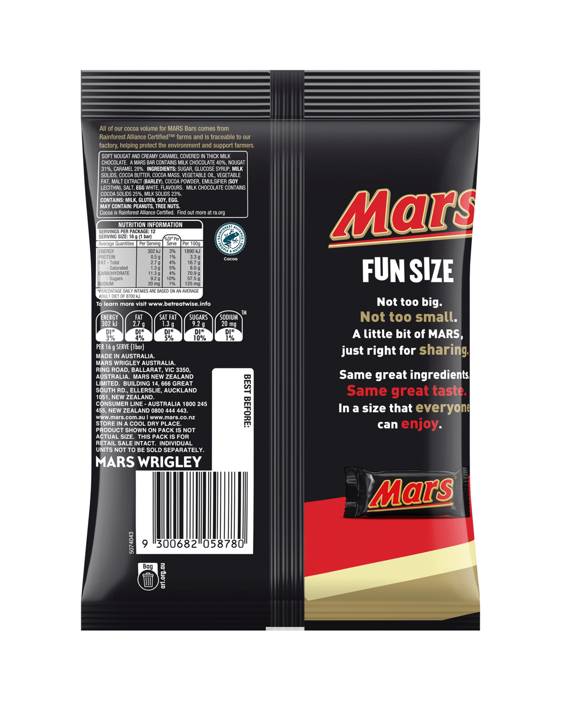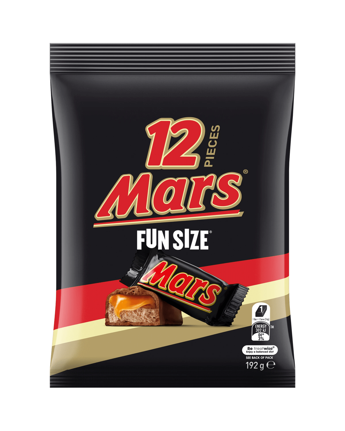 Not too big. Not too small. These crowd-pleasing, party-loving Mars Fun Size chocolate bars in a share pack of 12 are perfect for rewarding and sharing. Each delicious individually wrapped Mars chocolate bar in this share pack captures the legendary taste of soft nougat, slathered in caramel and covered in thick milk chocolate. Stock your pantry with this party chocolate bag and you'll have enough Mars Fun Size chocolates to prepare for anything from Halloween trick-or-treat bowls to lolly bags to packed lunches to mess-free treats! These individually wrapped fun size Mars bars are perfect for sharing with others or treating yourself and others. Mars - For you who did that thing you did.