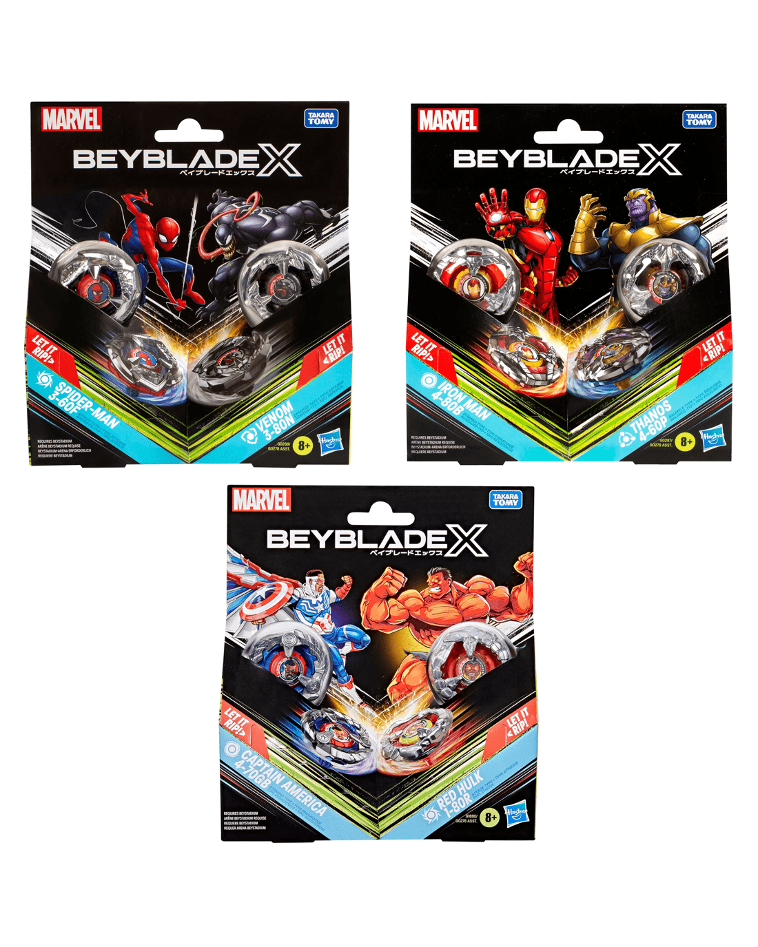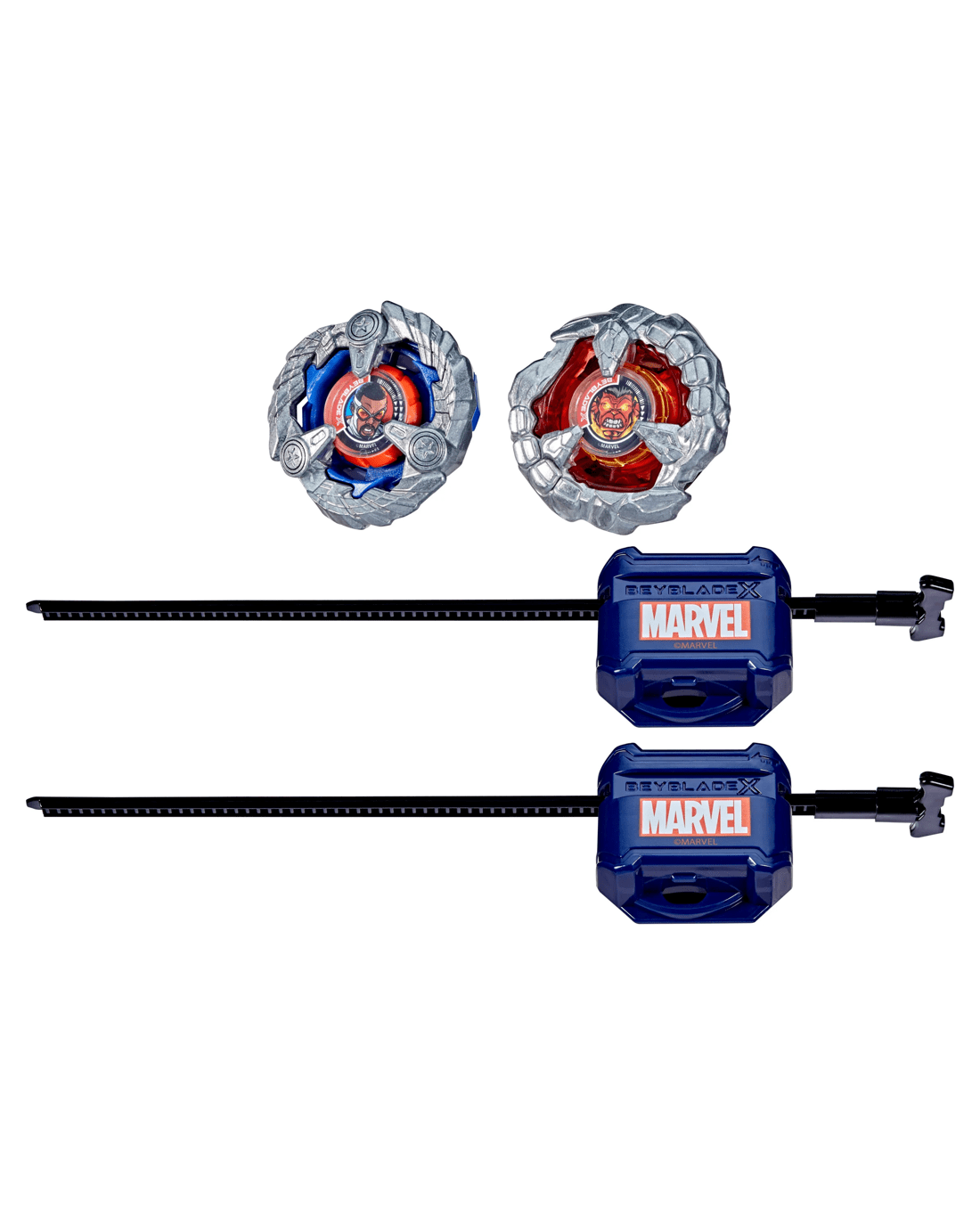 Experience the thrill of the next generation of Beyblade stadiums, launchers and tops: Beyblade X with the Beyblade X Marvel Collab Multipack Set, which includes two right-spinning tops and two launchers (Beystadium required, sold separately). Launch right into battle or reconfigure the interchangeable blade, ratchet and bit of tops in this Marvel Collab Multipack with those of other Beyblade X tops (sold separately) to create your own unsurpassable Bey.