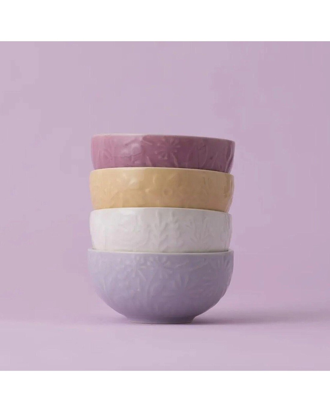 The dishes are in beautiful tones of pink, lilac, yellow, and cream.
