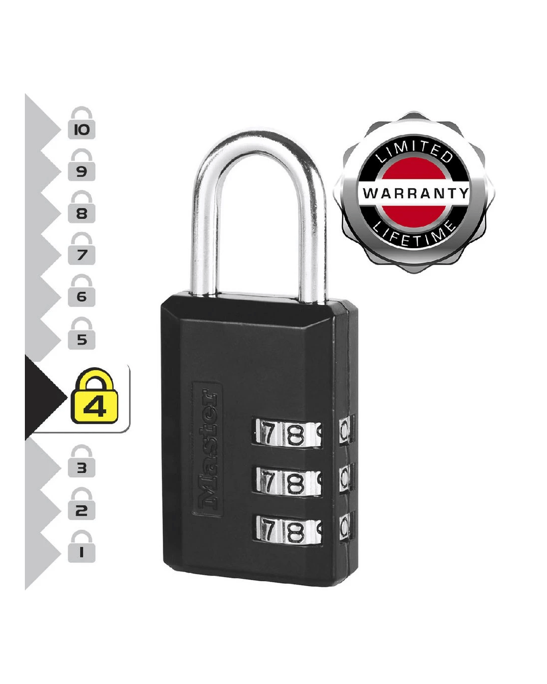 This Master Lock Luggage Padlock features a 30mm wide metal body for durability. The 5mm diameter shackle is 22mm long and made of steel, offering resistance to cutting and sawing. The 3 dial combination security offers keyless convenience.