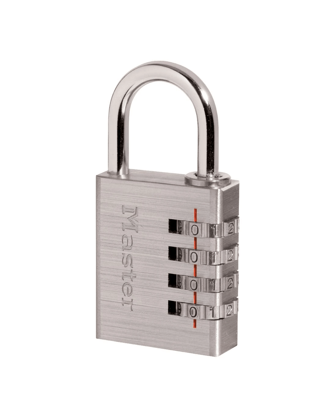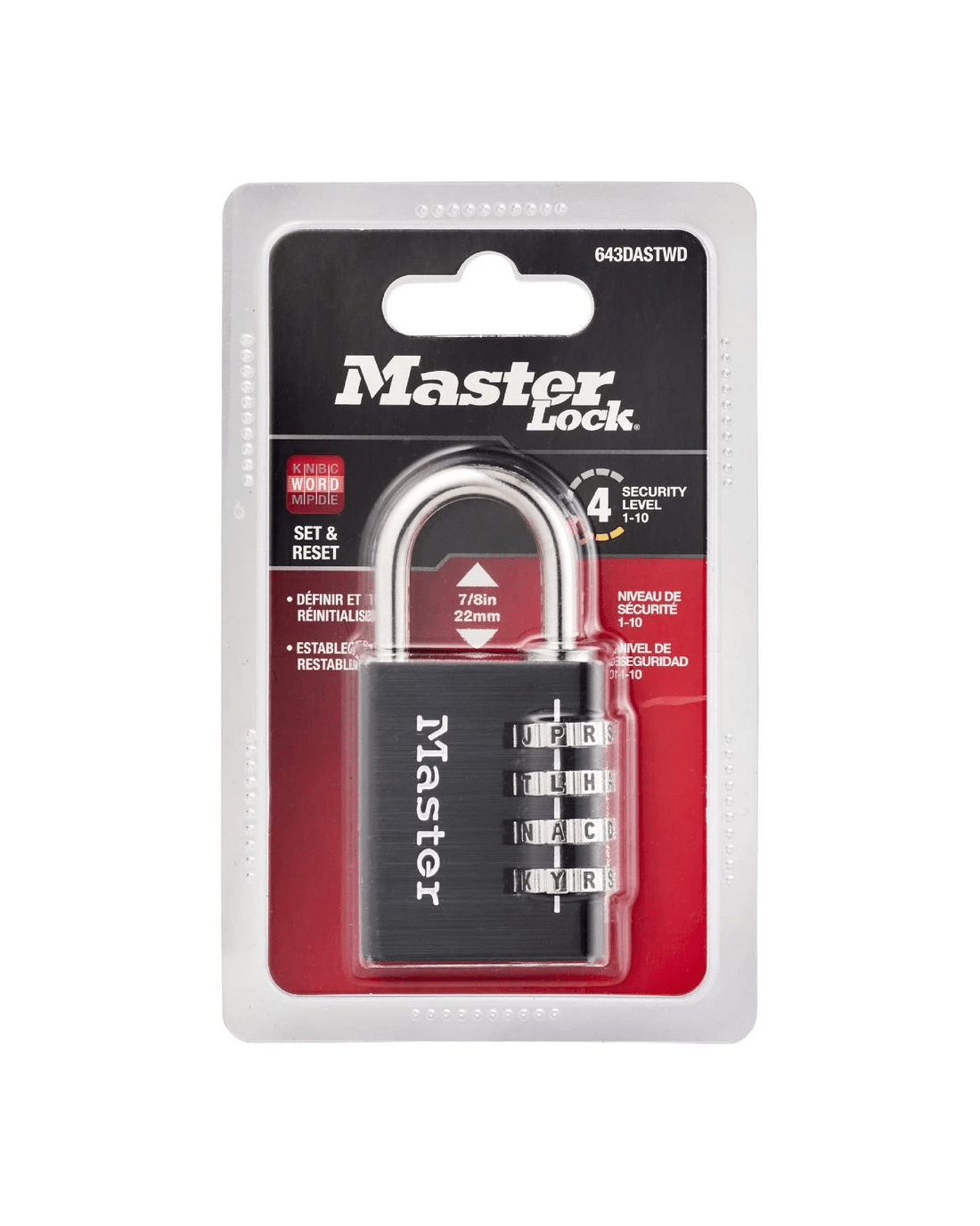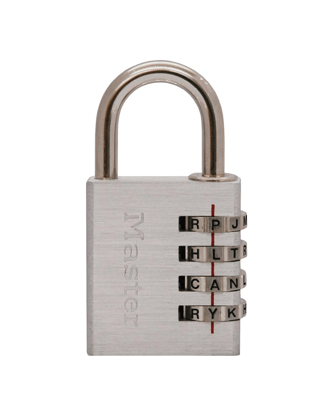 This Master Lock Word Combination Padlock features a 40mm wide metal body for durability. 6mm diameter shackle is 22mm long and made of nickel plated steel, offering resistance to cutting and sawing. The 4 dial combination security offers keyless convenience.