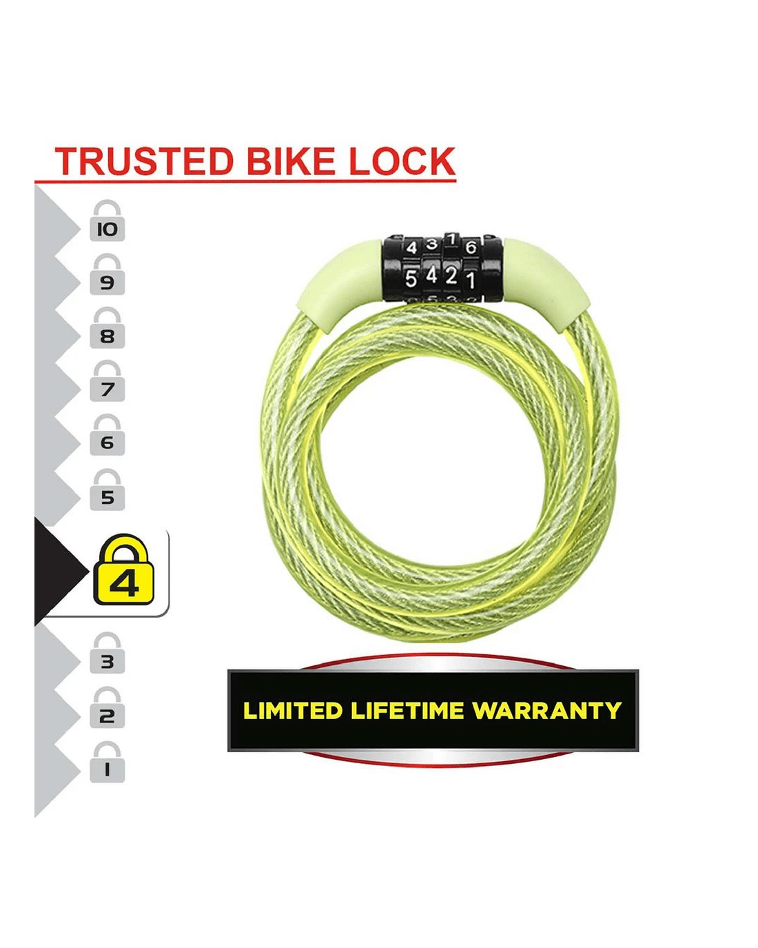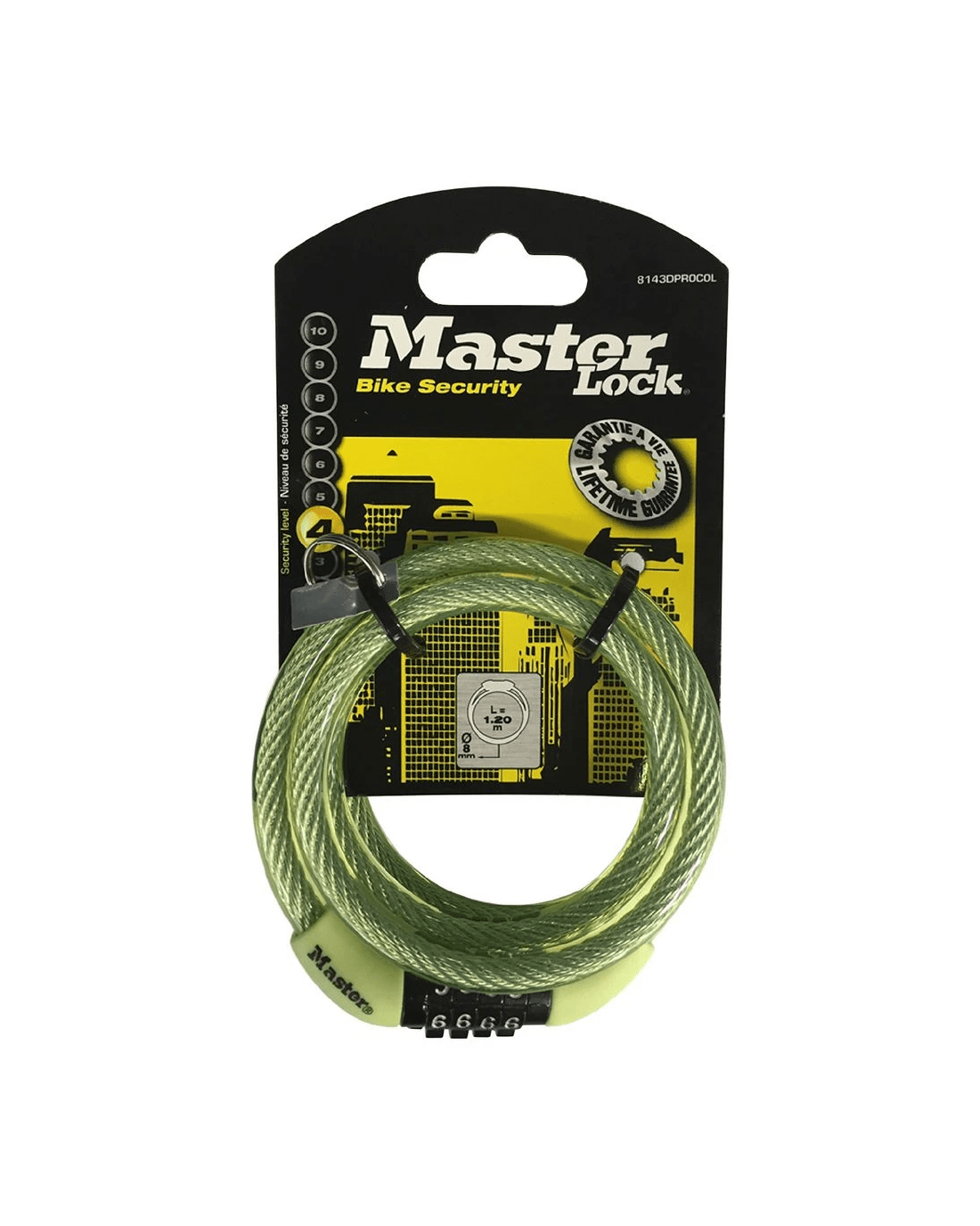 This Masterlock Combination Bike Lock is a great way to keep your bike secure. It is 1.2mm long and has twisted steel for strength and flexibility, with a vinyl coating protecting against scratches. It has a 4-digit combination access point so you don't have to carry a key around.