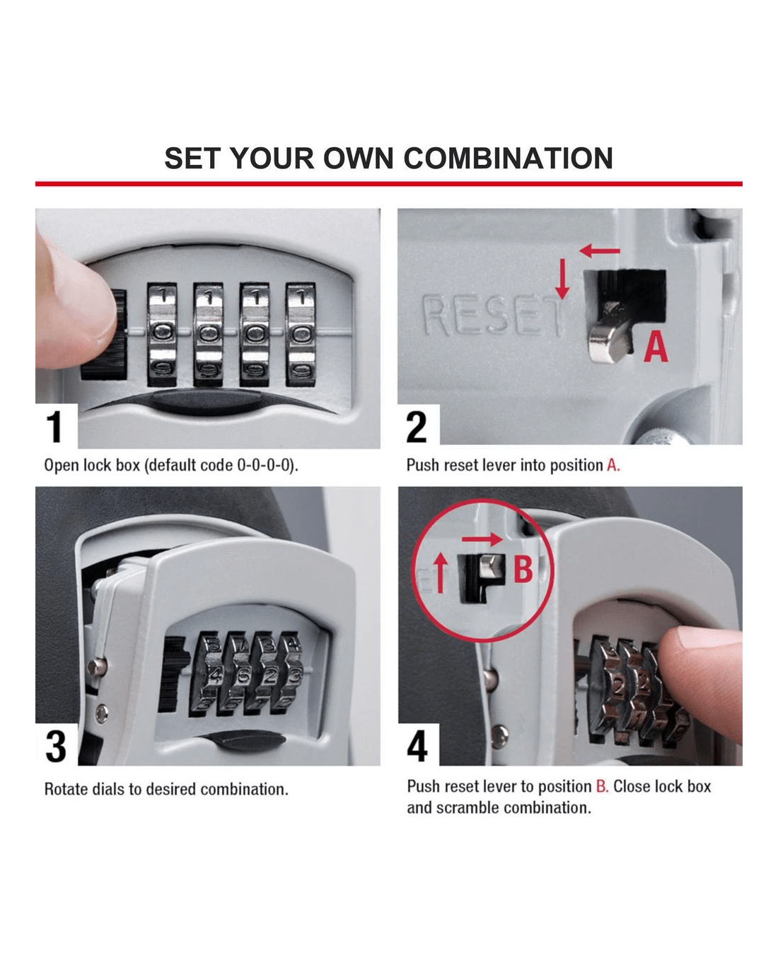 - It unlocks via a 4-digit combination which you can set yourself for convenient, keyless access.