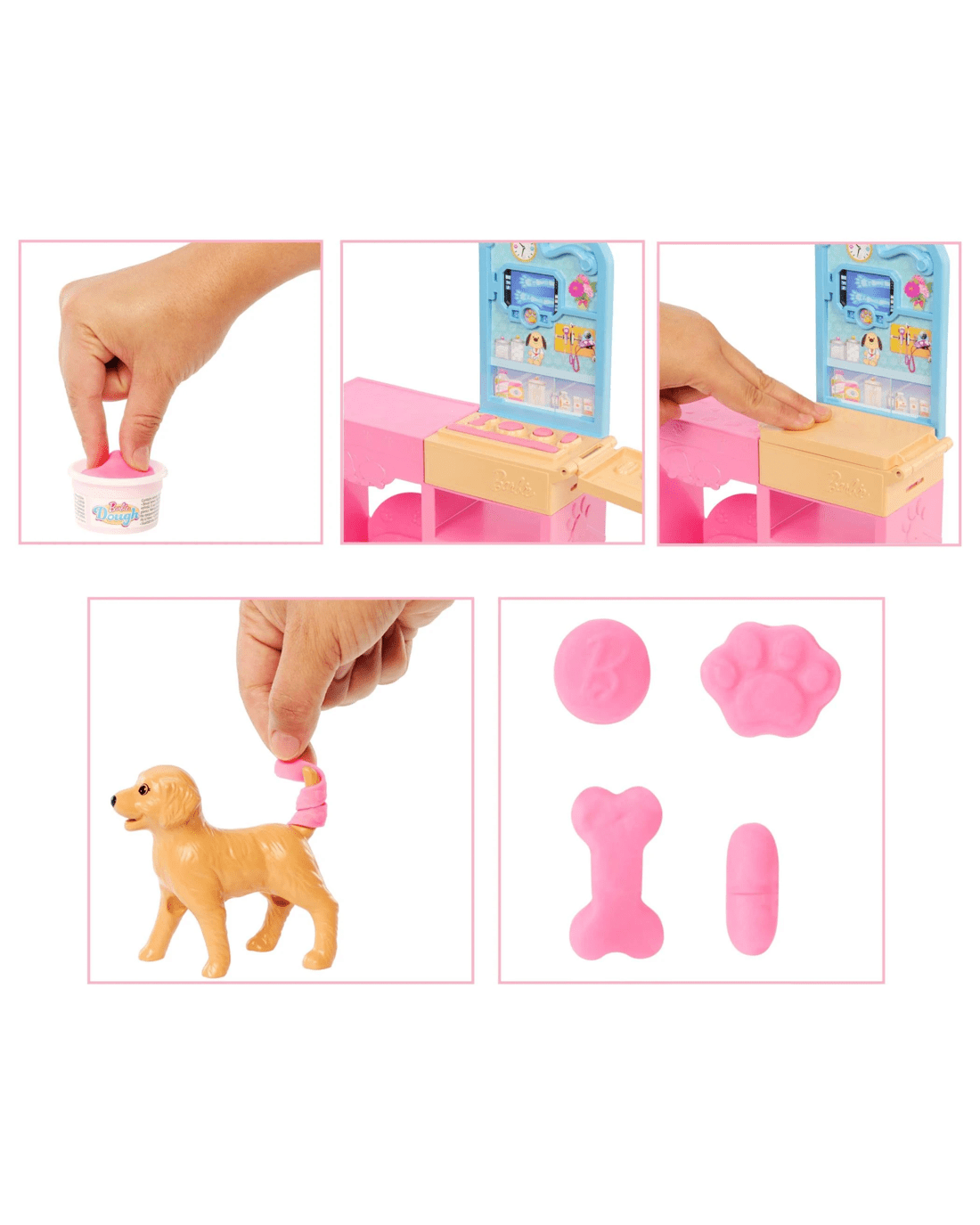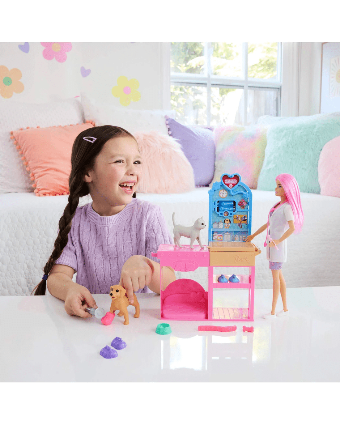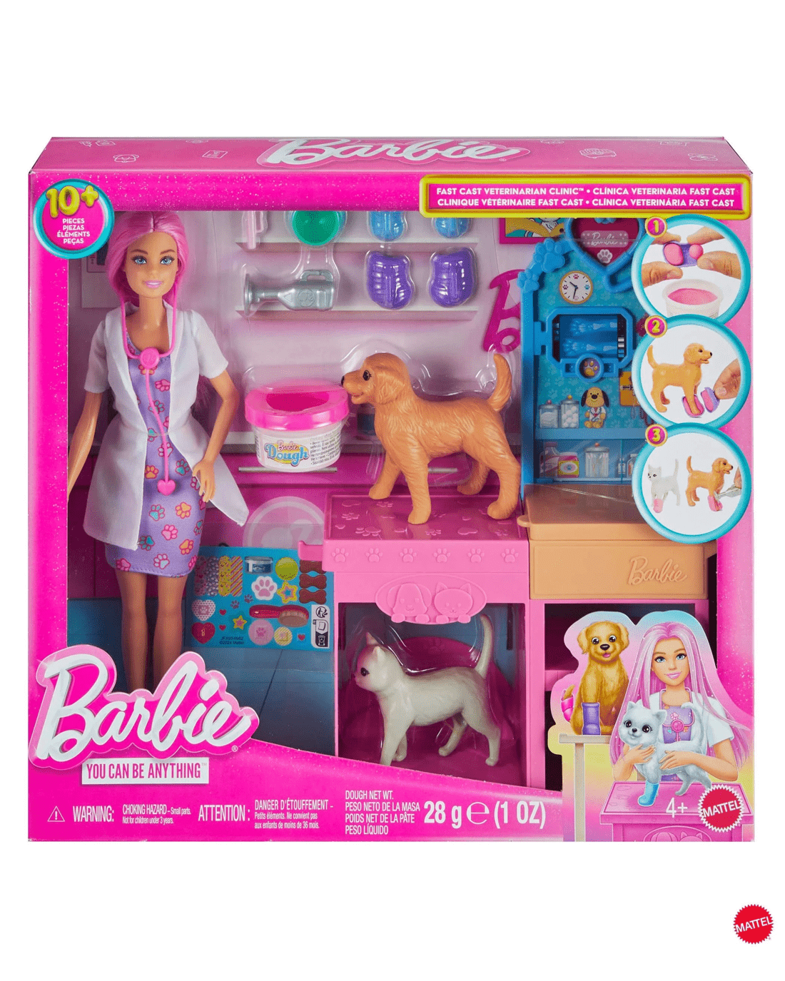 - The Barbie Fast Cast Veterinarian Clinic doll and playset inspires animal lovers to explore their dreams as a veterinarian with an exam table, puppy, cat, and 10+ pieces for career-play fun!