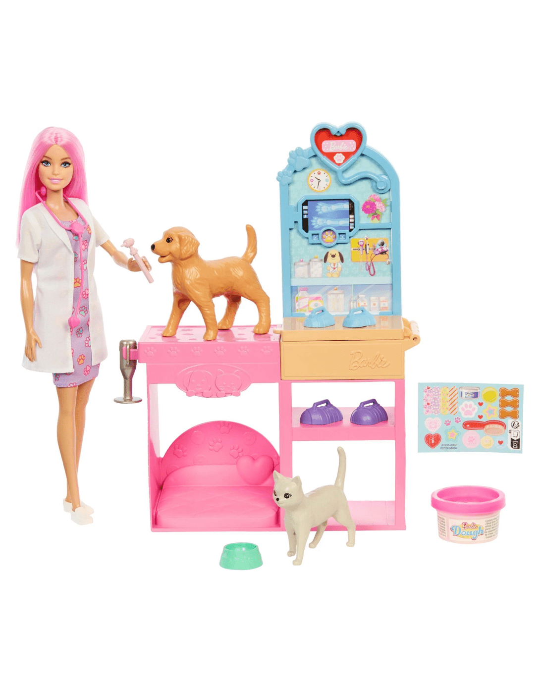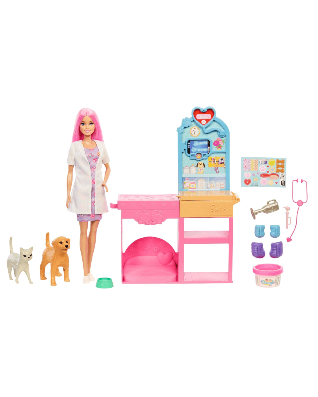 - The Vet Barbie doll includes fun pink hair with a patterned dress, white doctors coat, and white sneakers for a fun day on the job!