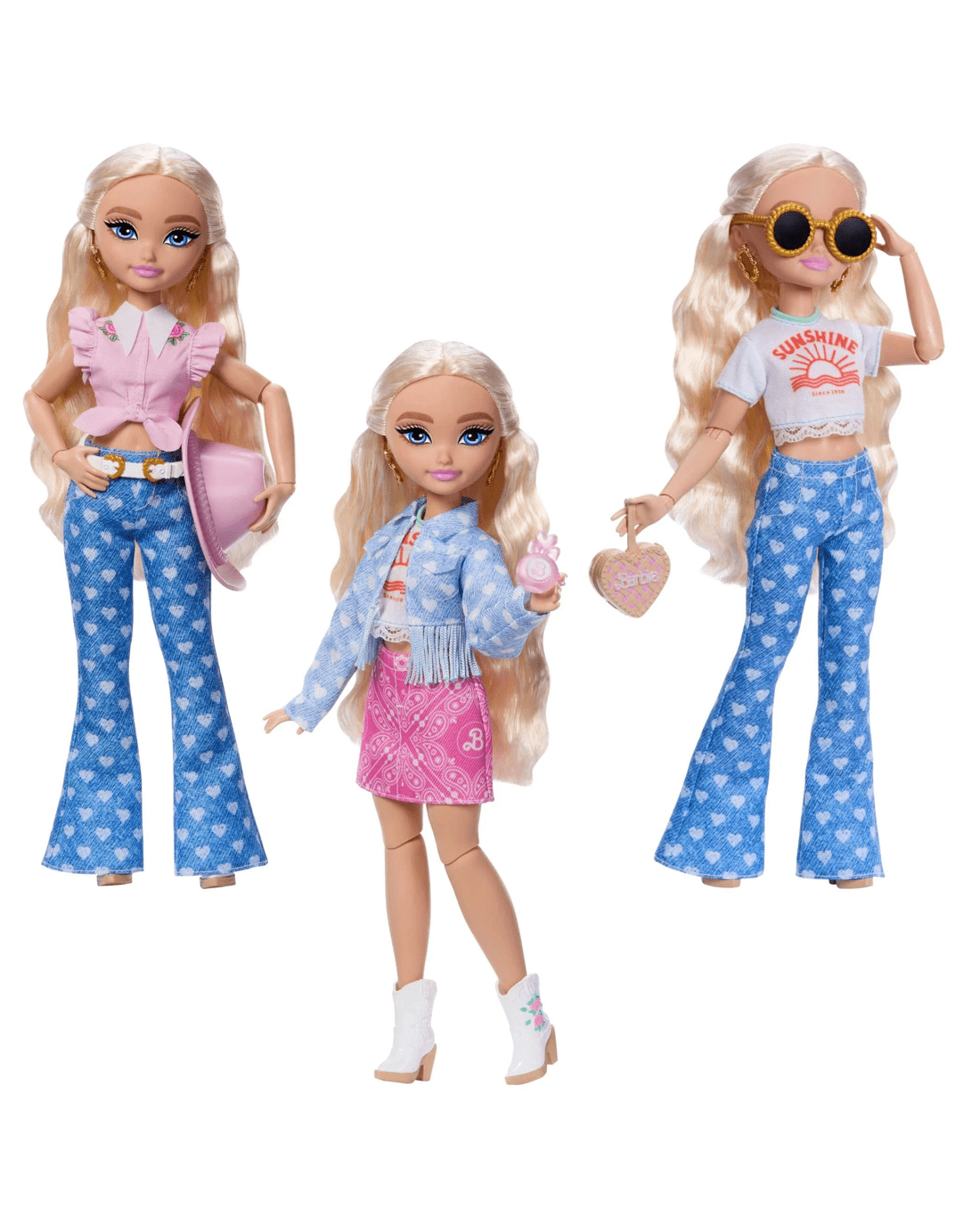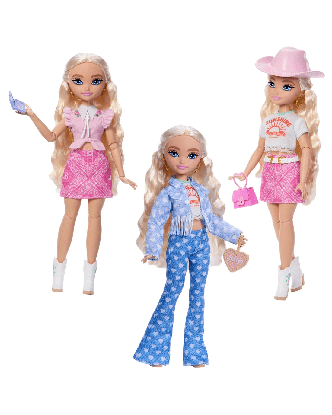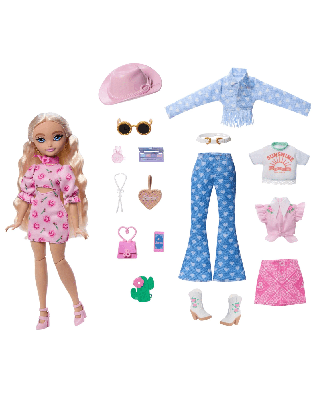 - Barbie 'Malibu' comes with removable fashions including, 2 tops, 1 paisley pink skirt, 1 denim fringe jacket and a matching pair of heart-printed jeans and 1 rose-printed dress.