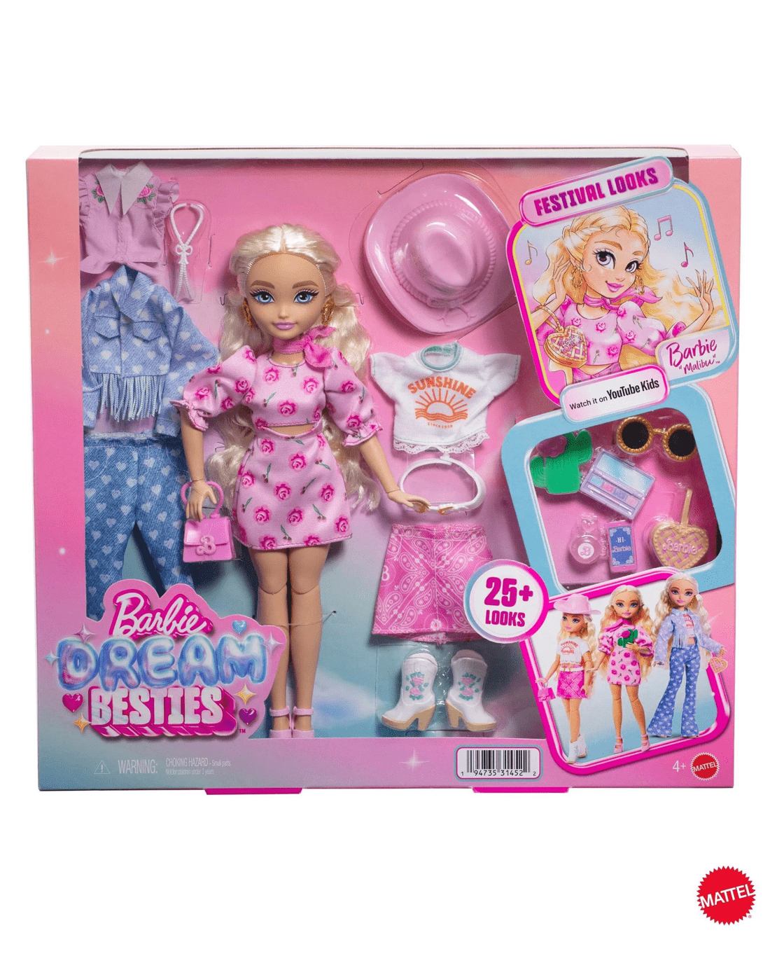 Get ready for a fun-filled festival adventure with the Mattel Barbie Malibu Doll Dream Besties Festival Looks Set. Join Barbie as she chooses from a range of trendy outfits and stylish accessories, designed for endless dress-up and imaginative play. Whether she's mixing and matching her paisley skirt, denim jacket or floral dress, every outfit lets Barbie shine in her own unique way. Her long, blonde hair adds to the styling excitement, just waiting for a new look each day. Perfect for little ones who love creativity and fashion, this set encourages kids to explore their own style and dream big. Add this cheerful Barbie to your collection and let the festival fun begin.