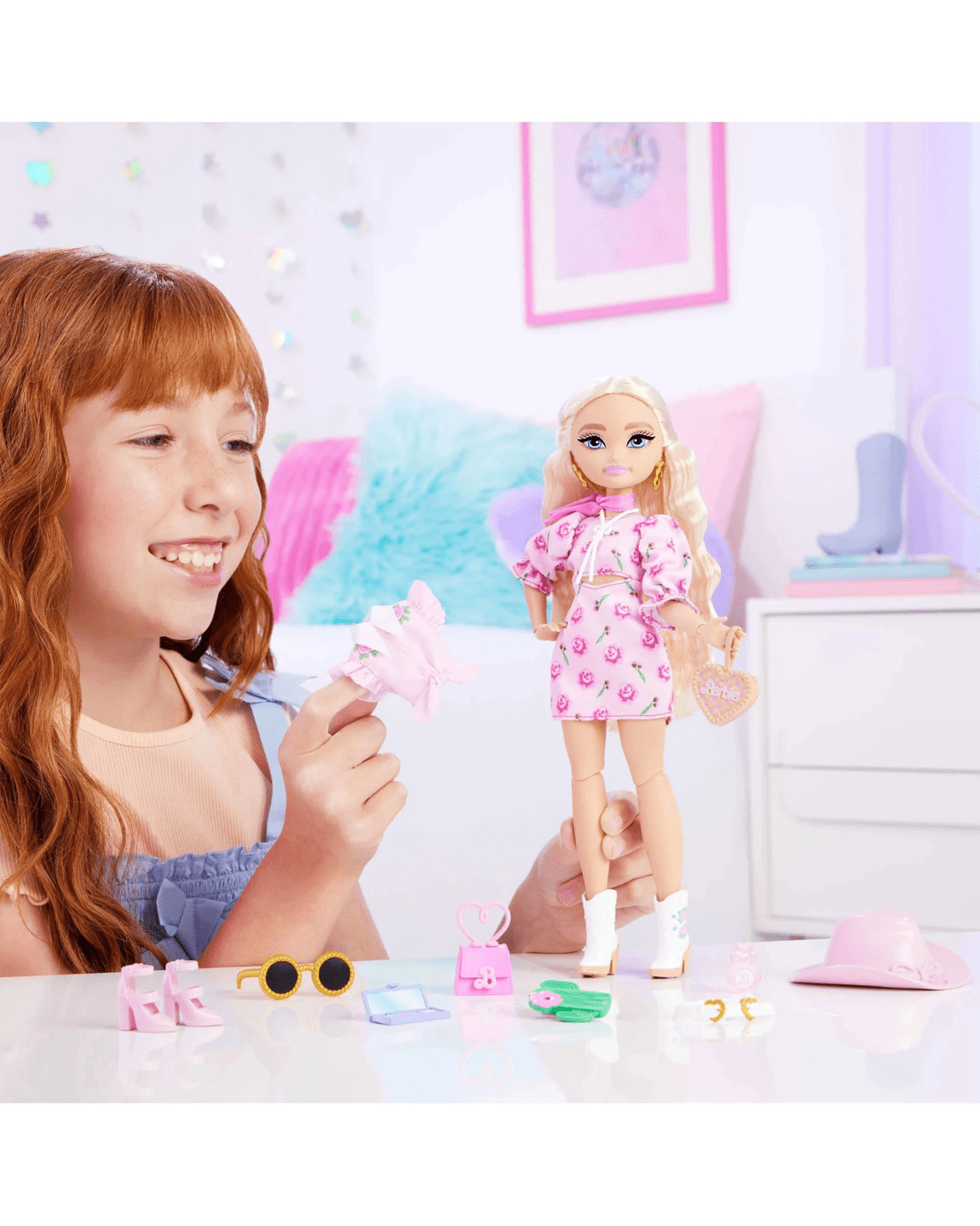 - Help Barbie accessorise and complete her outfit! She can pair it with cowboy boots, a cowboy hat, 2 different purses, a necklace, earrings, a scarf, sunglasses or a belt!