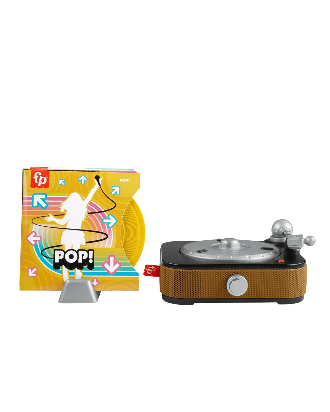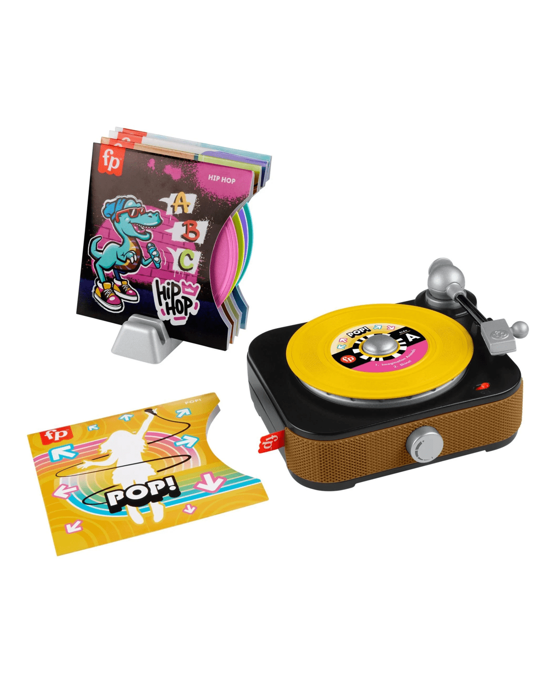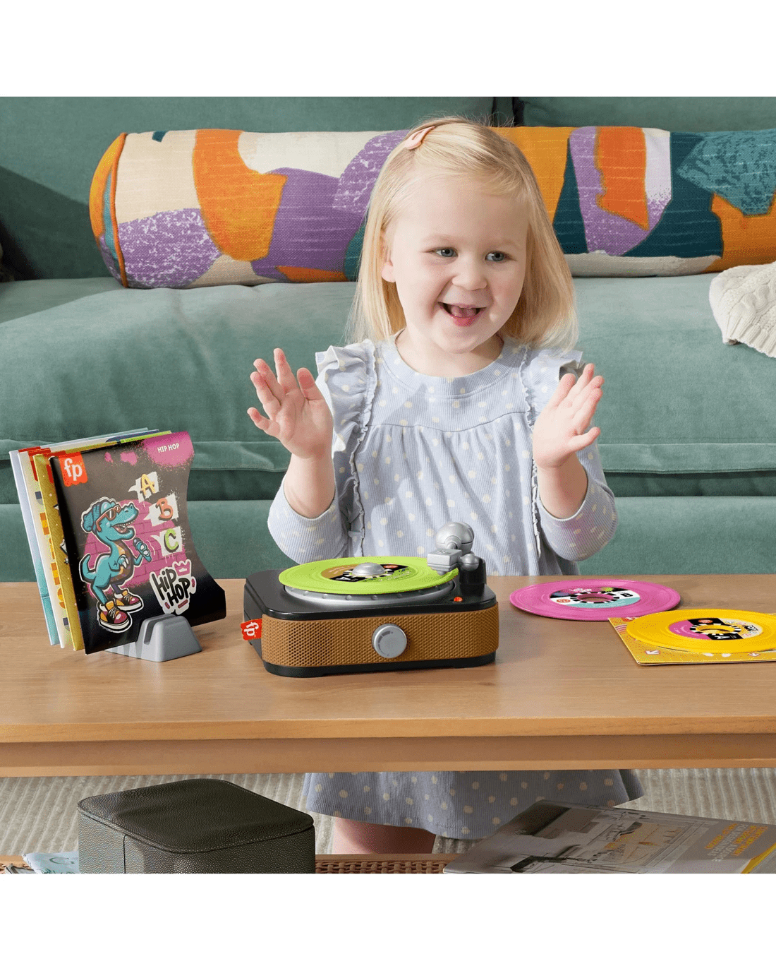 - Toy record player with a rotating turntable lets kids rock out to music in a fun, retro way