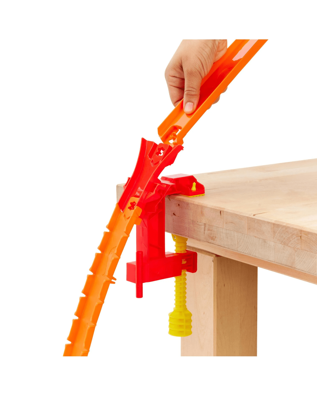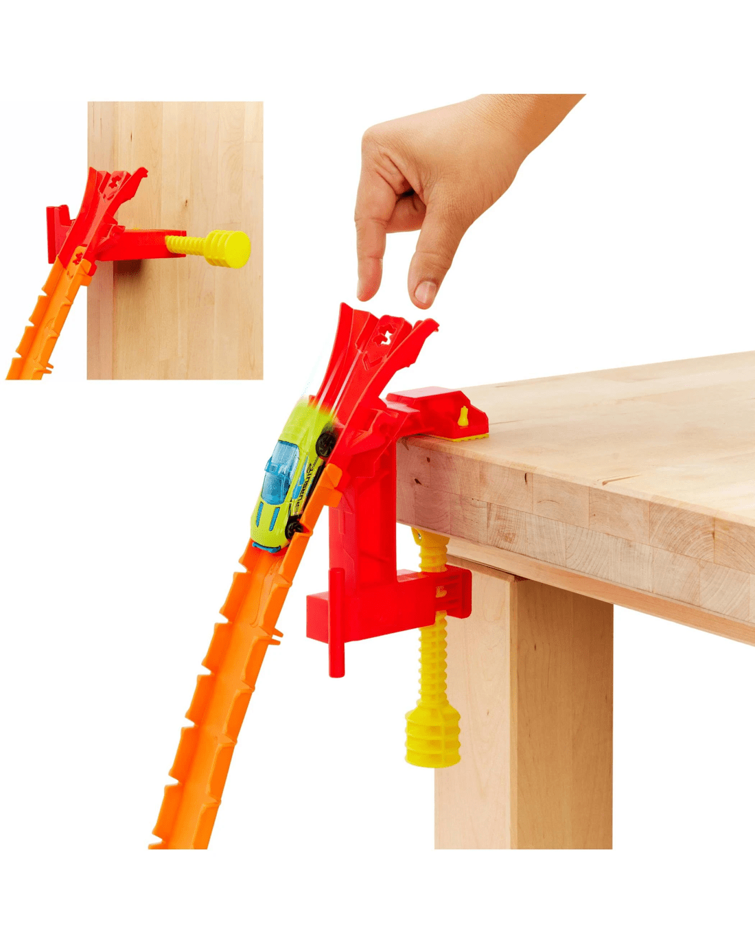 - The set includes an easy-to-use clamp for the gravity drop that sends vehicles speeding down a slope and into a variety of stunting possibilities.