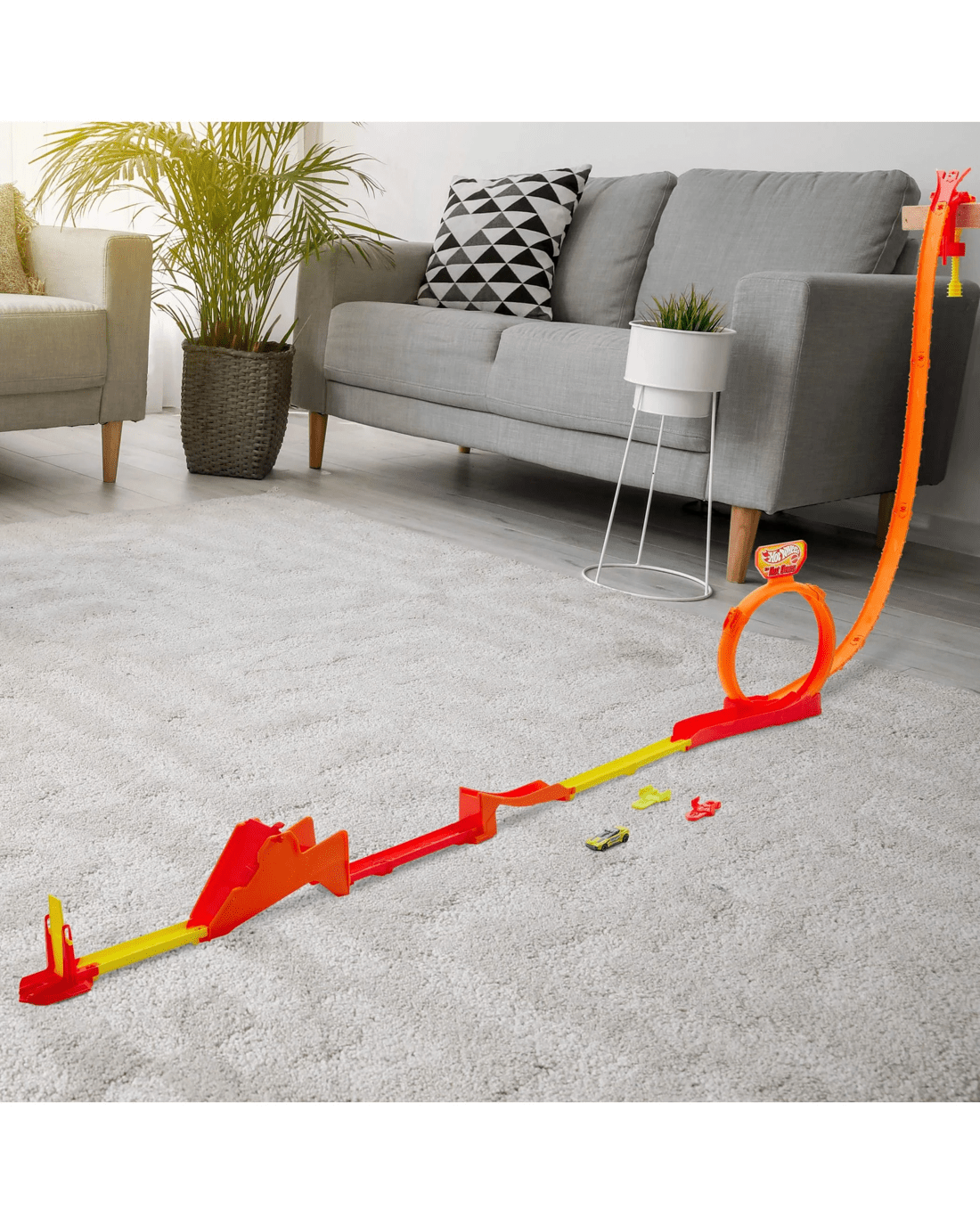 - One Hot Wheels 1:64 scale die-cast car is included for racing right out of the box.
