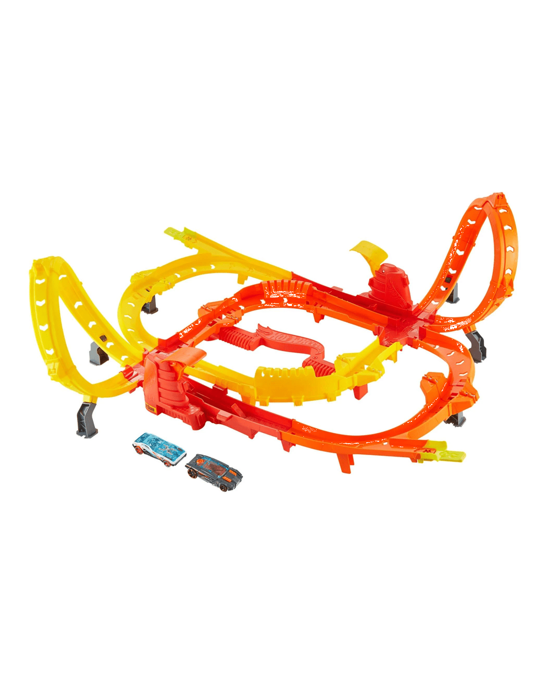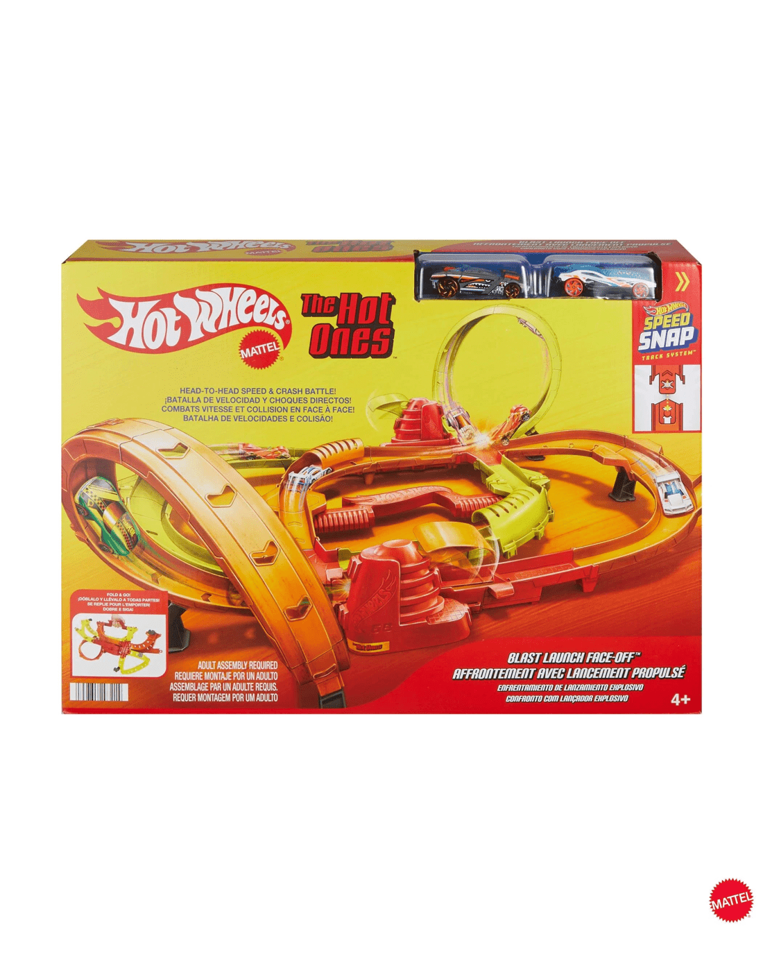 - Race, stunt and crash with the Hot Wheels Stunt Tracks Blast Launch Face-Off Track Set.