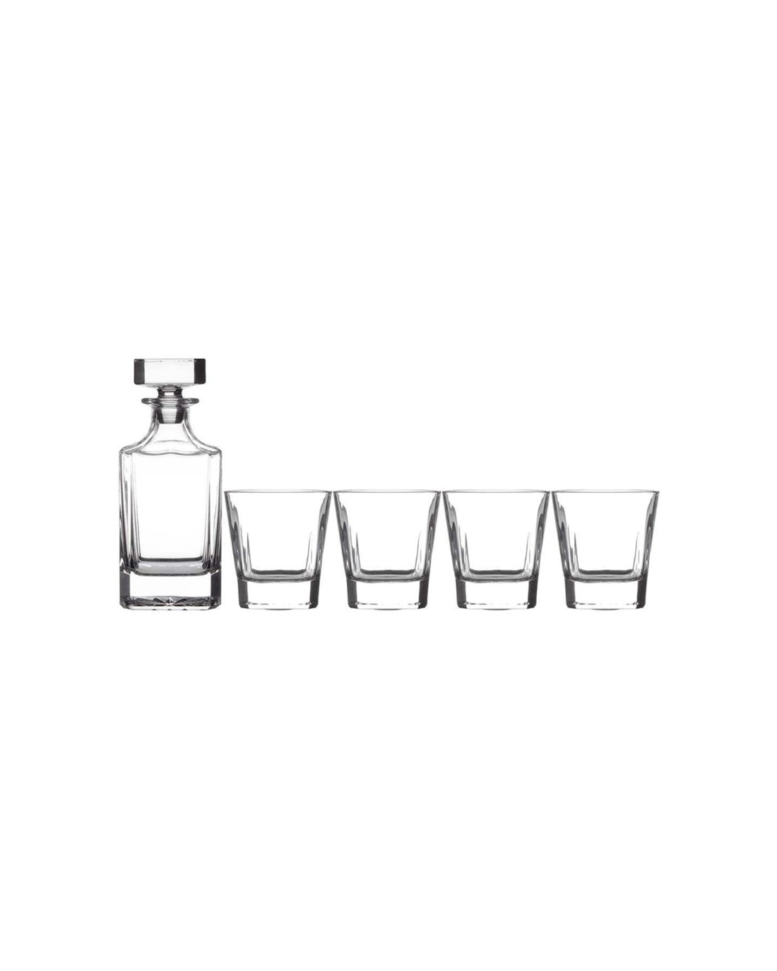 The set includes a 750ml decanter featuring a distinctive angular glass stopper, along with four flared tumblers of 320ml capacity each. Made entirely from high-quality glass, the set showcases a sleek, modern aesthetic that complements any interior decor. It is presented in a gift box, making it an ideal gift for special occasions or for elevating your own entertaining space.