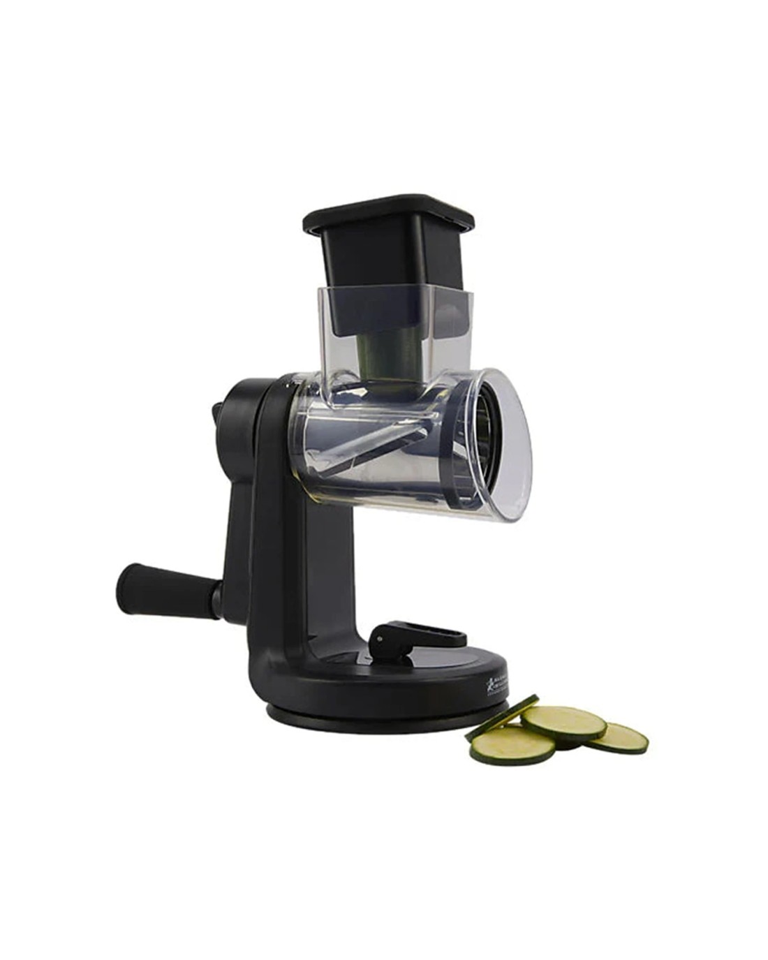 The grater features three interchangeable stainless-steel drums for slicing, fine grating, and coarse grating, allowing you to handle a variety of prep tasks with ease. The suction cup base provides stability during use, while the easy-to-operate hand crank ensures comfortable handling. Made from sturdy ABS and thermo plastic rubber, this kitchen tool is built for everyday durability and reliable performance.