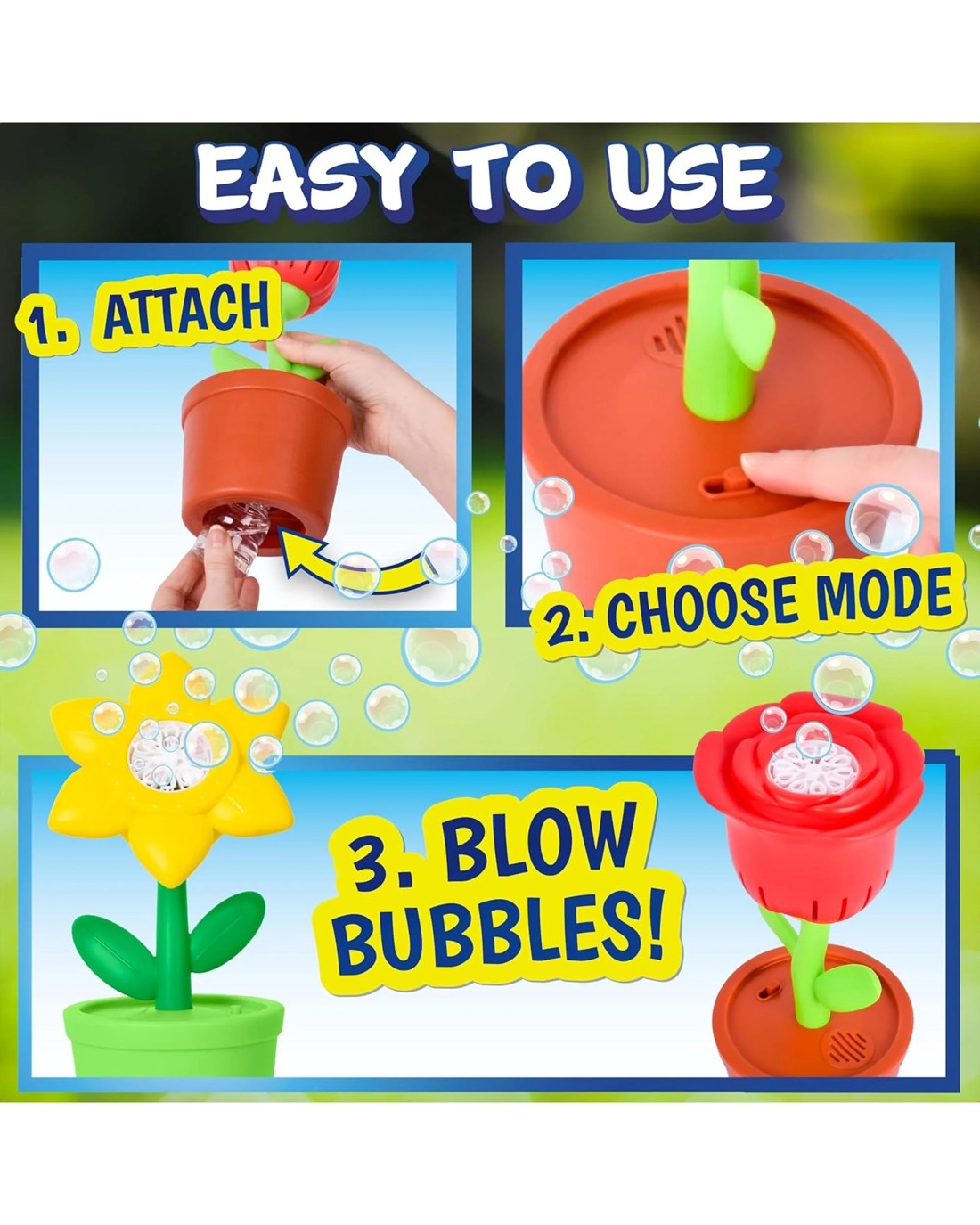 The Bubble Blooms spreads bubbles, joy, and surprise around. It adds value to outdoor activities whether it's day or night. Ages: 3+Contents