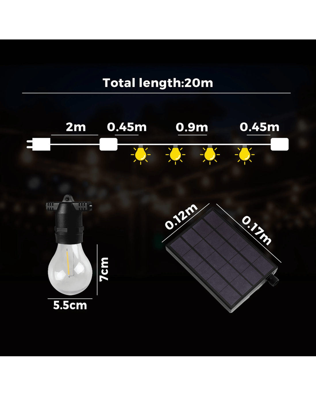 The energy-efficient solar powered festoon lights can operate up to 8 hours on a single charge and recharging (through solar or the optional USB port) is easy with the wall or grounded mounted control module. And with a long 2m distance between the charger and first connector, stringing up the lights involves minimum hassles and a choice of a 20m or 30m length makes the lights flexible for use to suit your requirements. Better still, the string lights can be connected end-to-end via plug-in connectors to extend the reach even further. Not least, the plastic LED bulbs are durable, replaceable and not prone to breakage unlike glass bulbs and the whole set up is rated IP65 for safe outdoor use.
