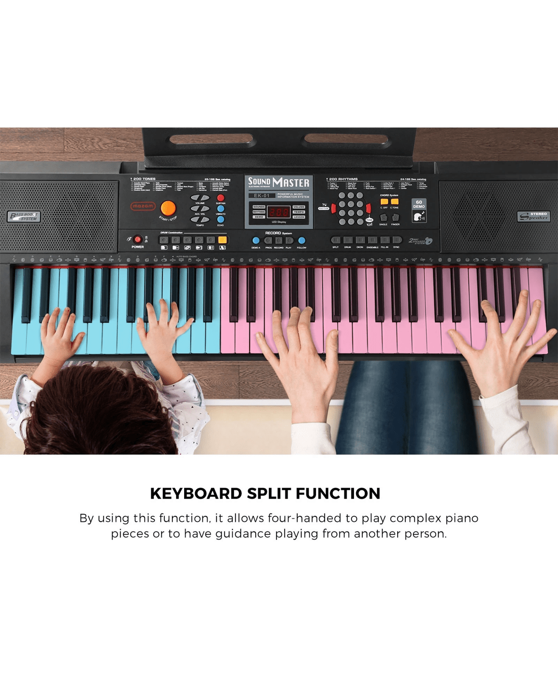 The first thing that you will notice about the keyboard is how wide the keys are. In fact, at 20mm wide, they are slightly wider than norm to allow easier playing without accidentally hitting other keys. On the LED control panel, you can have access to 200 tones, 200 rhythms, 6 percussion modes and sustain, vibrato, echo, chord tone effects to play your favourite songs or create new ones. You can also fine-tune your playing with the master volume, accompaniment volume, and tempo control to get the right dynamics with your songs. There is also a keyboard split function to let two players get into the act with ease.