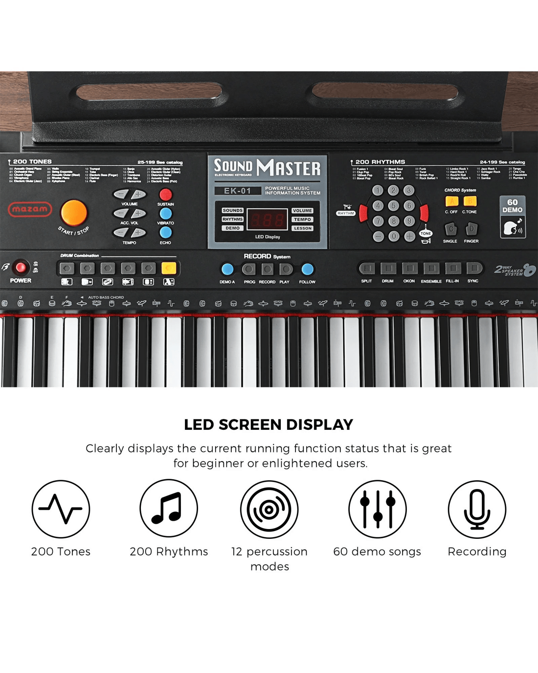 Perfect for intermediate players as well as novices, the Mazam Electronic Keyboard lets you play out your passion in music exceedingly. With a variety of functions and features, the 61-key keyboard makes for a competent one-person band.