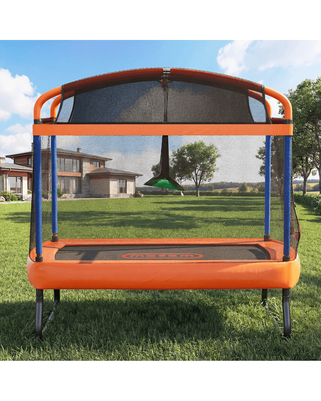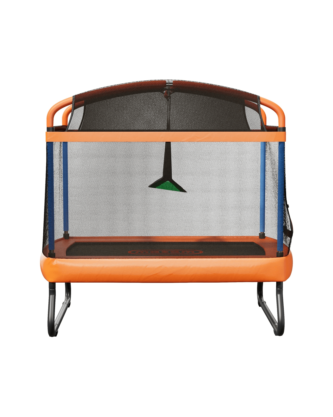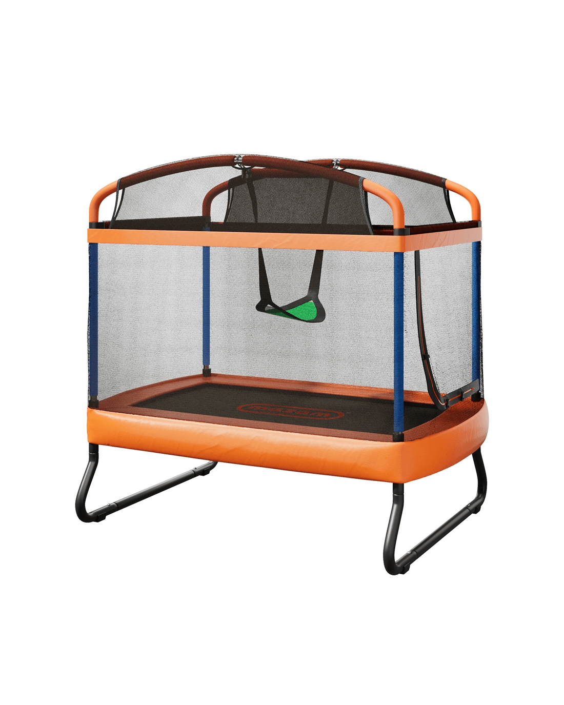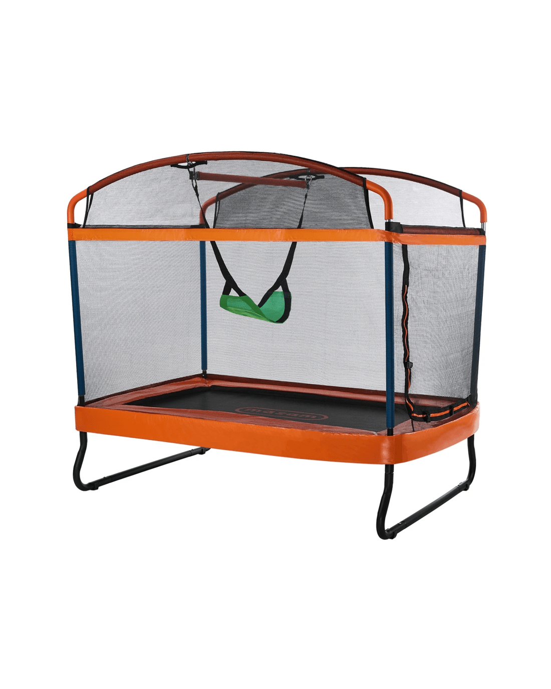 Suitable for outdoor or indoor use, our trampoline is built to exacting standards of weather durability and long-lasting strength to handle all the robust jumps, bounces, hops, skips and turns without ever flinching or wavering. Built tough to handle the rough! Plus, a cool hanging bar and fun swing are also added to the mix for even more swinging good times.