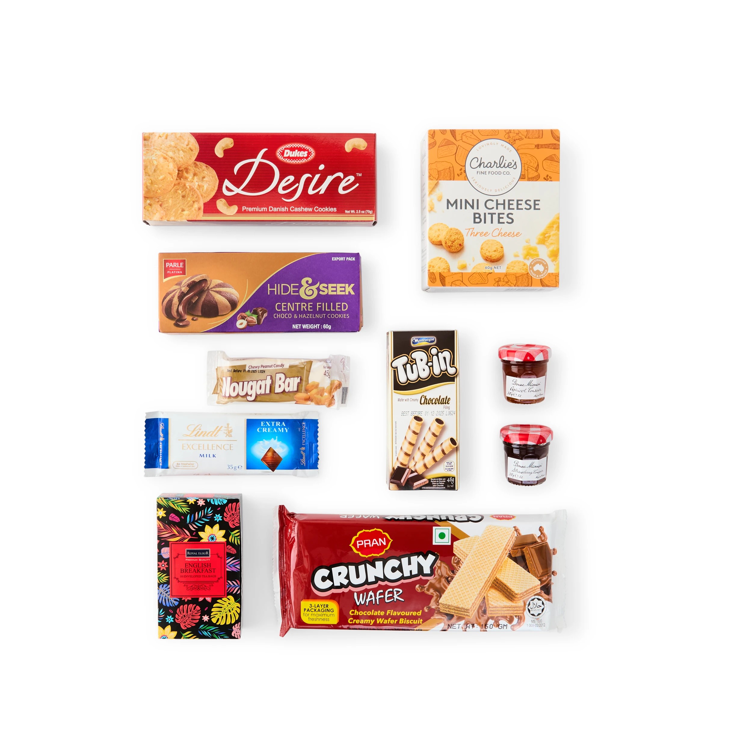- Includes 1 x Pran Crunchy Wafers, 1 x Dukes Choc Chip Cookie, 1 x Parle Hide & Seek Choco Rolls Cookies, 1 x Montevergine Choc. Filled Waf/Rolls, 1 x Charlies Fine Foods Mini Cheese Bites, 2 x Bonne Maman Jam, 1 x Lindt Chocolate Bar, 10 x Royal Elixir English Breakfast Tea Flat Pack and 1 x Nougat Bar With Nuts