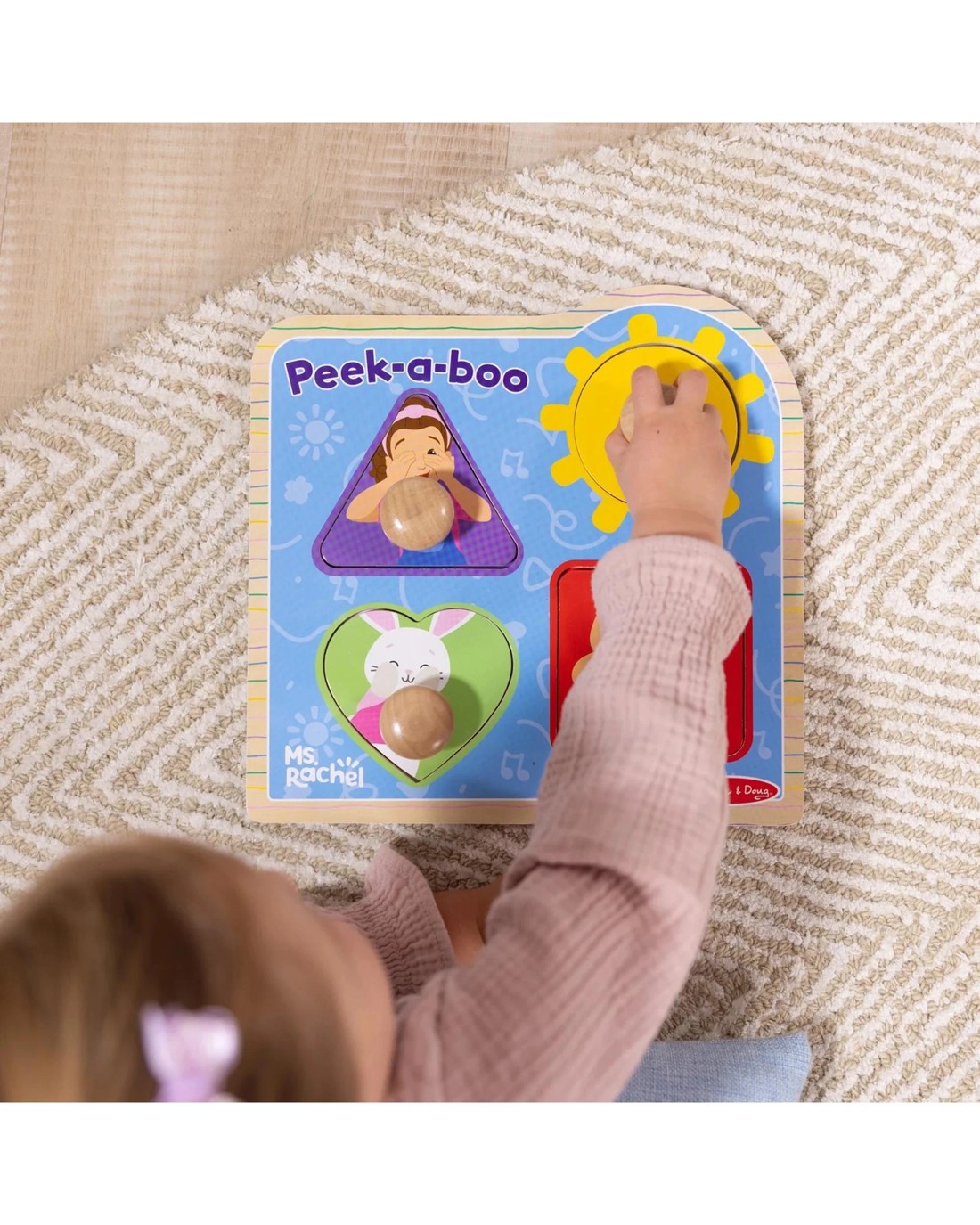 - OFFICIAL MS. RACHEL TOYS: Play peek-a-boo, and learn shapes with 4 wooden puzzle pieces with easy to grip jumbo wooden pegs, featuring Ms. Rachel and friends from her show, and a special child-safe mirror to reflect baby's smiling face