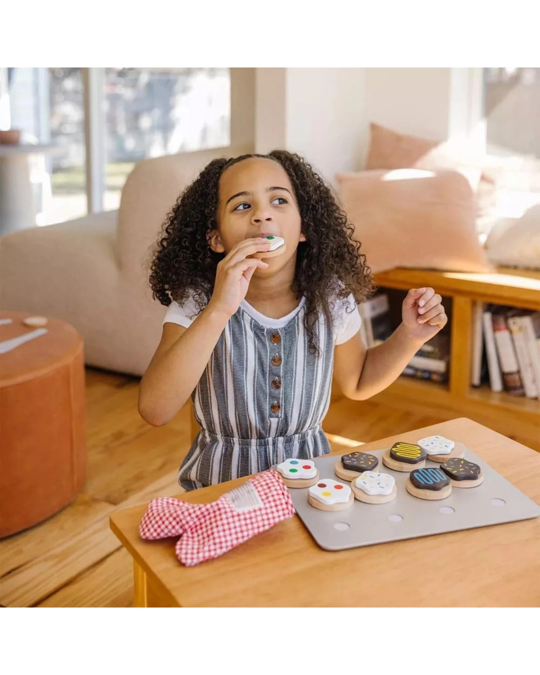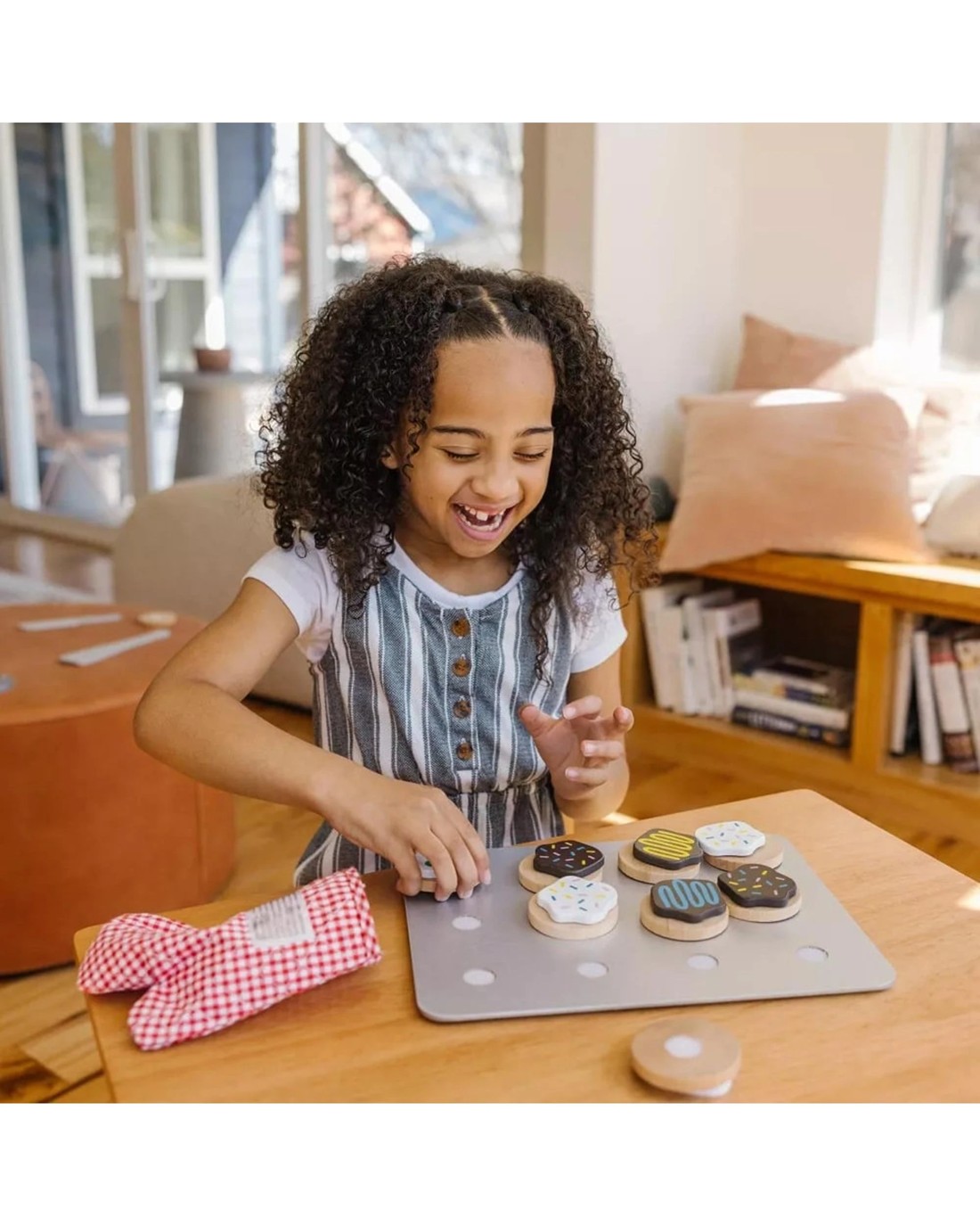 - Colourful wooden play food set includes 12 sliceable cookies, 12 toppings, knife, spatula, cookie sheet, and kitchen mitt