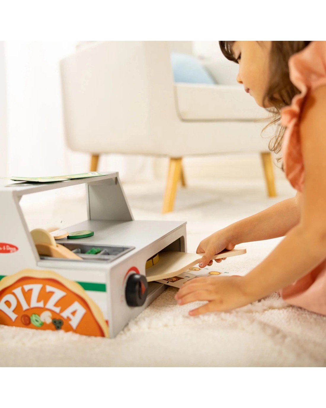 - Create made-the-way-you-like-it pretend pizza with 41-piece wooden play pizza-making set with counter/pizza oven