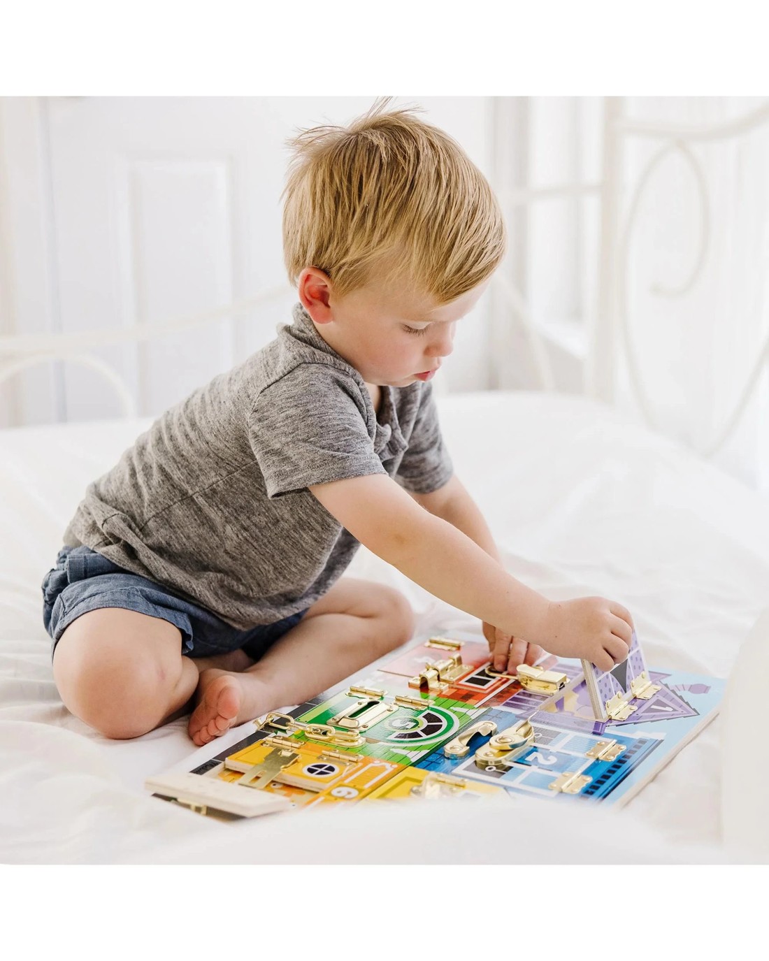 - Activity play board helps kids build dexterity as they figure out how 6 different latches work