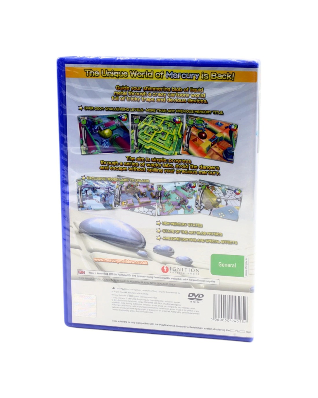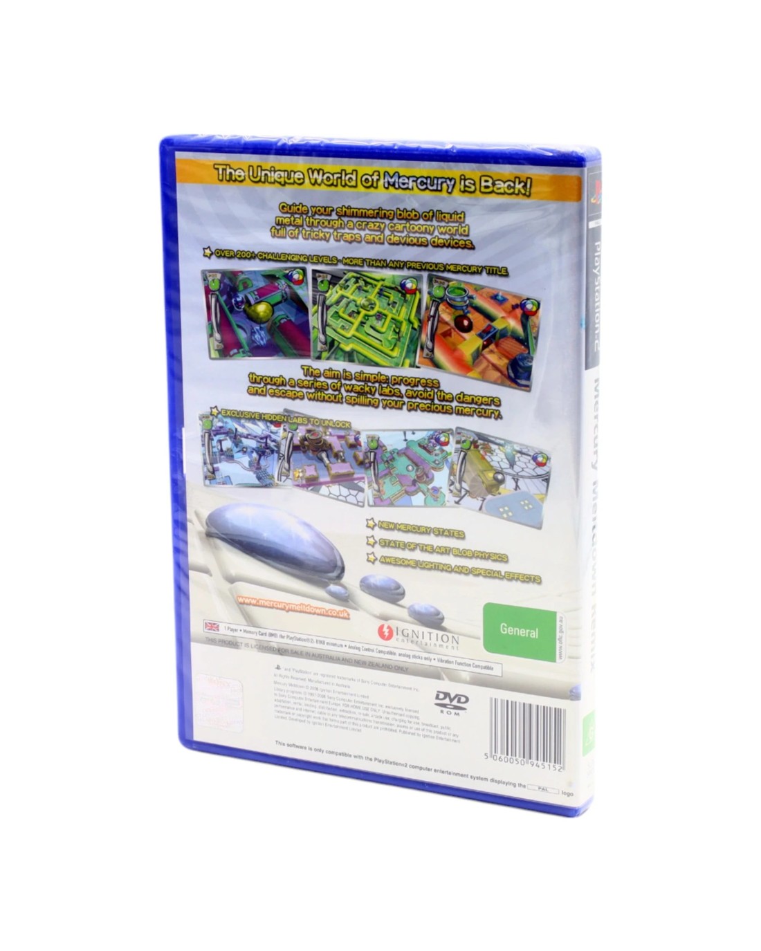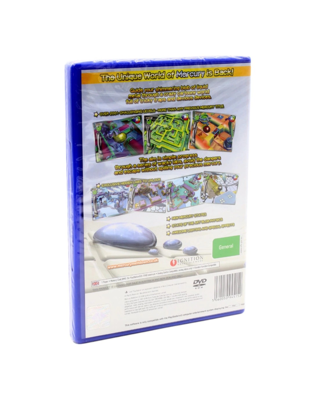 Once again taking control of the liquid Mercury 'blob', players must avoid various obstacles and hazards to reach the end goal. The Mercury blob itself has now been given an overhaul and has 4 varying 'states' - Normal, Solid, Fast and Slow. These states allow for larger more complex levels, which in turn mean a greater challenge and more enjoyment to be had for the player. The number of levels has more than doubled - now 160+, and with the newly added feature of Downloadable Content more levels will be made available at a later date. Wireless 2 Player modes have also been an important addition, with 5 sub games each providing a challenge against the computer or a friend.
