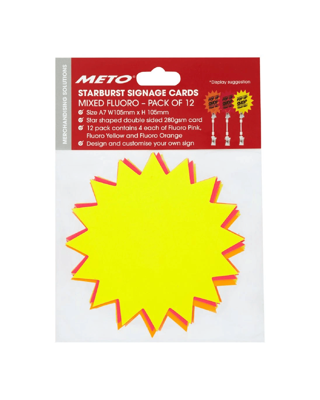 These Meto Starburst Sign Cards are a great option for your workspace or business thanks to the eye-catching colours. The cards come in a variety of fluoro colours and are easy to display with signage stands.