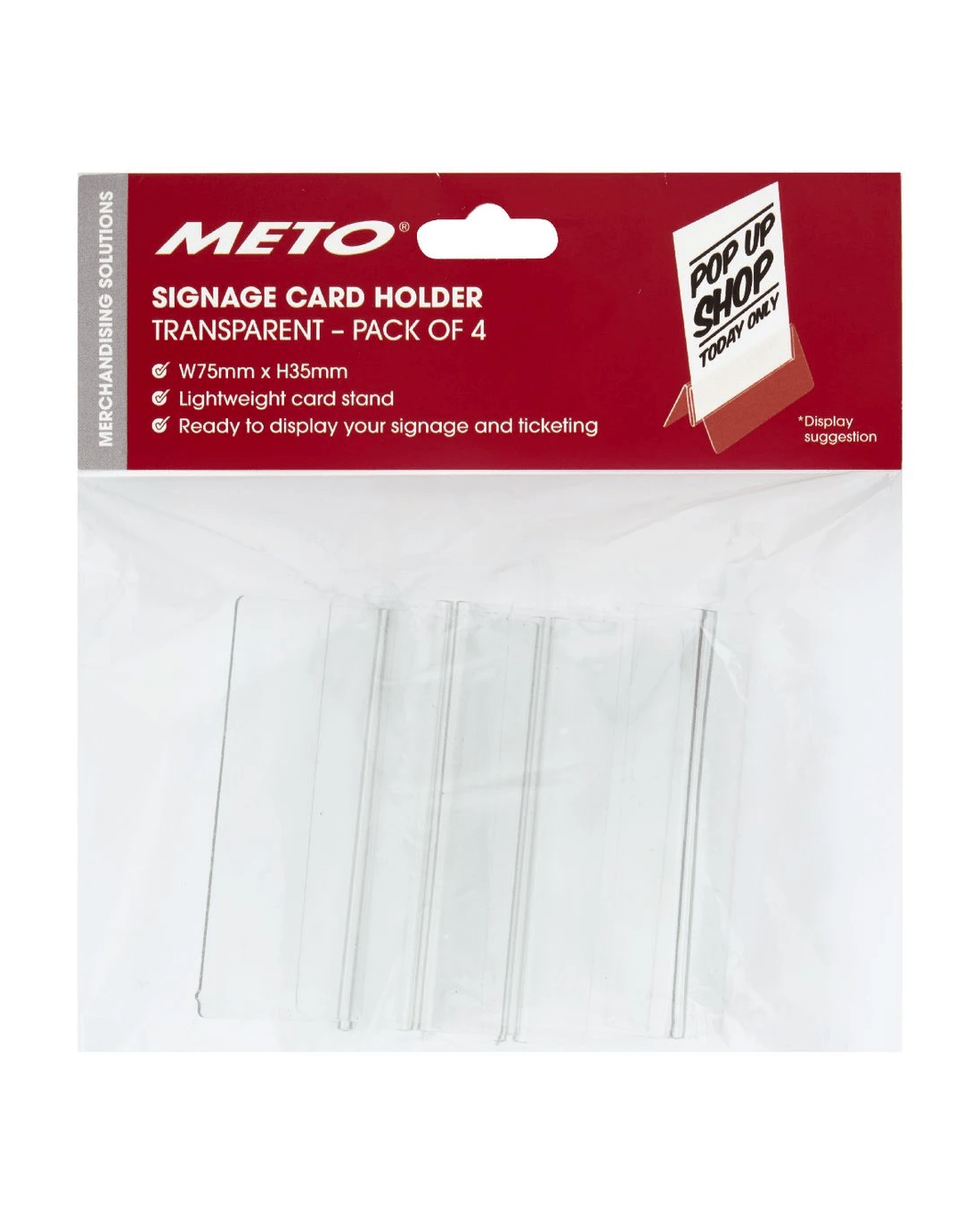 Each Meto Card Stand is double-sided so you can use it to display signage, tickets and more. They have a durable PET construction and comes in a handy 4 pack for multiple displays.